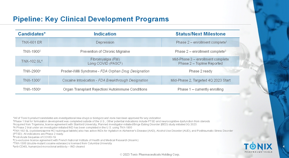 3 © 2023 Tonix Pharmaceuticals Holding Corp. Investment Highlights RICH PIPELINE OF THERAPEUTICS CANDIDATES IN DEVELOPMENT Tonix’s core focus is on central nervous system disorders, but we also target unmet needs across multiple therapeutic areas including immunology, infectious disease and rare disease. STRATEGIC PARTNERSHIPS Partnering strategically with other biotech companies, world-class academic and non-profit research organizations to bring innovative therapeutics to market faster. IN-HOUSE CAPABILITIES Internal capabilities in R&D and biologics process development and GMP manufacturing to accelerate development timelines. MARKETED PRODUCTS Tonix Medicines markets two FDA-approved products Zembrace ® SymTouch ® (sumatriptan injection) and Tosymra ® (sumatriptan nasal spray) for the treatment of acute migraine in adults with or without aura 1 ZembraceSymTouch[packageinsert].MapleGrove,MN:Upsher-SmithLaboratories,LLC:February2021-Formoreinformation,talktoyourproviderandreadthePatientInformationand InstructionsforUse.–ImportantSafetyInformationisprovidedintheappendix 2 Tosymra [package insert]. Maple Grove, MN: Upsher-Smith Laboratories, LLC: Feb 2021 .For more information, talk to your provider and read the Patient Informationand Instructionsfor Use.– Important Safety Information is provided in the appendix Zembrace, SymTouchand Tosymraare registered trademarks of Tonix Medicines. Intravailis a registered trademark of Aegis Therapeutics, LLC, a wholly owned subsidiary of Neurelis, Inc.