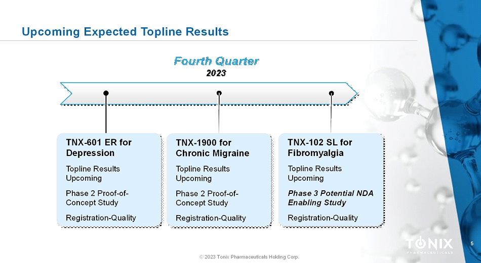 4 © 2023 Tonix Pharmaceuticals Holding Corp. Pipeline: Key Clinical Development Programs Status/Next MilestoneIndicationCandidates* Phase 2 –enrollment complete 1 DepressionTNX-601 ER Phase 2 –enrollment complete 3 Prevention of Chronic MigraineTNX-1900 2 Mid-Phase3 –enrollment complete Phase 2 –Topline Reported Fibromyalgia (FM) Long COVID (PASC 5 ) TNX-102 SL 4 Phase 2 readyPrader-Willi Syndrome -FDA Orphan Drug DesignationTNX-2900 6 Mid-Phase 2, Targeted 4Q 2023 StartCocaine Intoxication -FDA Breakthrough DesignationTNX-1300 7 Phase 1 –currently enrollingOrgan Transplant Rejection/ Autoimmune ConditionsTNX-1500 8 *All of Tonix’s product candidates are investigational new drugs or biologics and none has been approved for any indication. 1 Phase 1 trial for formulation development was completed outside of the U.S.; Other potential indications include PTSD and neurocognitive dysfunction from steroids 2 Acquired from Trigemina; license agreement with Stanford University; Planned investigator-initiated Binge Eating Disorder (BED) study initiated 3Q 2023. 3 A Phase 2 trial under an investigator-initiated IND has been completed in the U.S. using TNX-1900 4 TNX-102 SL (cyclobenzaprine HCl sublingual tablets) also has active INDs for Agitation in Alzheimer’s Disease (AAD), Alcohol UseDisorder (AUD), and Posttraumatic Stress Disorder (PTSD). All indications are Phase 2 ready. 5 Post-Acute Sequelae of COVID-19. 6 Co-exclusive license agreement with French National Institute of Health and Medical Research (Inserm) 7 TNX-1300 (double-mutant cocaine esterase) is licensed from Columbia University 8 anti-CD40L humanized monoclonal antibody –IND cleared