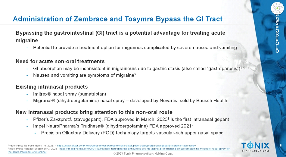 7 © 2023 Tonix Pharmaceuticals Holding Corp. C N S P O R T F O L I O Two Marketed Proprietary Migraine Drugs Autoinjector and Nasal Spray (Non-oral) Formulations of Sumatriptan • Each indicated for the treatment of acute migraine with or without aura in adults • Sumatriptan remains the acute migraine ‘gold standard’ treatment for many patients and continues to represent the largest segment of the market in terms of unit sales 3 • Each may provide migraine pain relief in as few as 10 minutes for some patients 1,2,4,5 • Patents to 2036 (Zembrace) and 2031 (Tosymra) 1 ZembraceSymTouch[packageinsert].MapleGrove,MN:Upsher-SmithLaboratories,LLC: February2021-Formoreinformation,talktoyourproviderandreadthePatientInformation andInstructionsforUse.–ImportantSafetyInformationisprovidedintheappendix 2 Tosymra [package insert]. Maple Grove, MN: Upsher-Smith Laboratories, LLC: Feb 2021 .For more information, talk to your provider and read the Patient Informationand Instructions for Use.–Important Safety Information is provided in the appendix 3 Upsher-Smith Laboratories, LLC; Data On File, 2023 Zembrace® SymTouch® (sumatriptan injection) 3 mg 1 Tosymra® (sumatriptan nasal spray) 10 mg 2 Consolidated Product Sales for the 12 months ended March 31 st 2023 • Factory sales: $30.4M 3 • Net sales: $16.4M 3 Retail Product Sales for the 12 months ended December 31 st 2022 • Retail sales: ~$23 M (Zembrace ~$19.6 M and Tosymra ~$3.5 M) 4 Acquired from Upsher-Smith Laboratories which has managed care contracts covering ~200 M lives • Contract includes a transition period during which Tonix expects to secure its own contracts 4 Mathew NT, et al. Dose ranging efficacy and safety of subcutaneous sumatriptan in the acute treatment of migraine. US Sumatriptan Research Group. Arch Neurol. 1992;49(12):1271-1276. 5 Wendt J, et al. A randomized, double-blind, placebo-controlled trial of the efficacy and tolerability of a 4-mg dose of subcutaneous sumatriptan for the treatment of acute migraine attacks in adults. Clinical Therapeutics. 2006;28(4):517-526. Zembrace, SymTouchand Tosymraare registered trademarks of Tonix Medicines. Intravailis a registered trademark of Aegis Therapeutics, LLC, a wholly owned subsidiary of Neurelis, Inc.