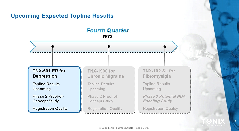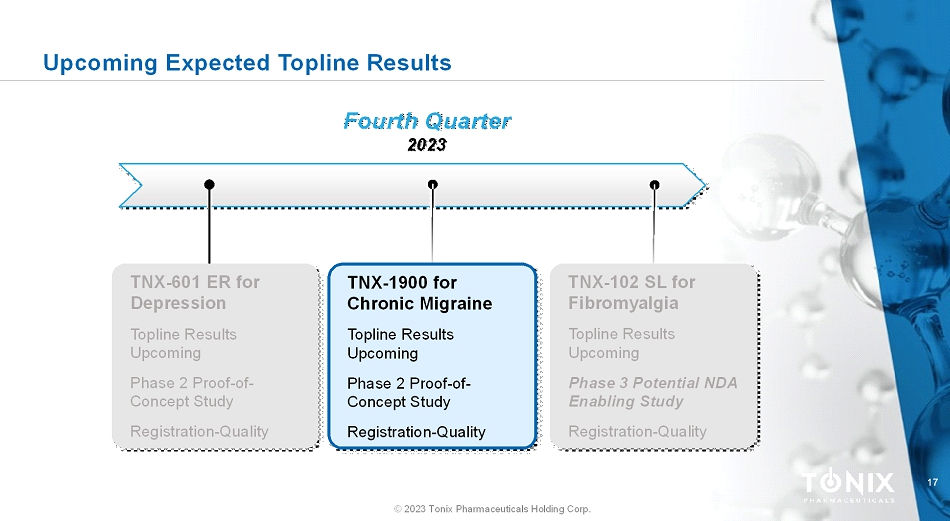 22 © 2023 Tonix Pharmaceuticals Holding Corp. Upcoming Expected Topline Results Fourth Quarter 2023 TNX-1900 for Chronic Migraine Topline Results Upcoming Phase 2 Proof-of- Concept Study Registration-Quality TNX-601 ER for Depression Topline Results Upcoming Phase 2 Proof-of- Concept Study Registration-Quality TNX-102 SL for Fibromyalgia ToplineResults Upcoming Phase 3 Potential NDA Enabling Study Registration-Quality