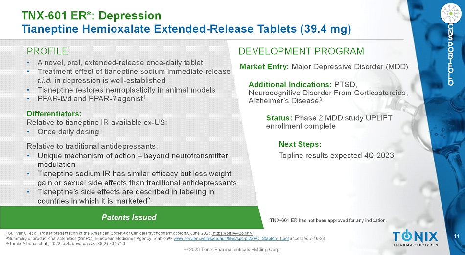 10 © 2023 Tonix Pharmaceuticals Holding Corp. Upcoming Expected Topline Results Fourth Quarter 2023 TNX-1900 for Chronic Migraine Topline Results Upcoming Phase 2 Proof-of- Concept Study Registration-Quality TNX-601 ER for Depression Topline Results Upcoming Phase 2 Proof-of- Concept Study Registration-Quality TNX-102 SL for Fibromyalgia ToplineResults Upcoming Phase 3 Potential NDA Enabling Study Registration-Quality
