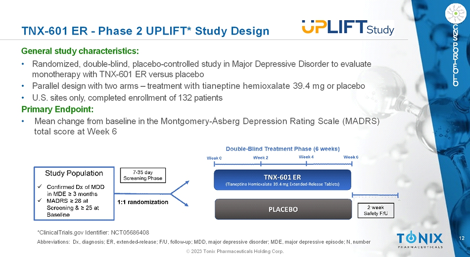 11 © 2023 Tonix Pharmaceuticals Holding Corp. C N S P O R T F O L I O PROFILE DEVELOPMENT PROGRAM Patents Issued TNX-601 ER*: Depression Tianeptine HemioxalateExtended-Release Tablets (39.4 mg) C N S P O R T F O L I O • A novel, oral, extended-release once-daily tablet • Treatment effect of tianeptine sodium immediate release t.i.d.in depression is well-established • Tianeptine restores neuroplasticity in animal models • PPAR-ß/dand PPAR-?agonist 1 Differentiators: Relative to tianeptine IR available ex-US: • Once daily dosing Relative to traditional antidepressants: • Unique mechanism of action –beyond neurotransmitter modulation • Tianeptine sodium IR has similar efficacy but less weight gain or sexual side effects than traditional antidepressants • Tianeptine’s side effects are described in labeling in countries in which it is marketed 2 Market Entry: Major Depressive Disorder (MDD) Additional Indications: PTSD, Neurocognitive Disorder From Corticosteroids, Alzheimer’s Disease 3 Status:Phase 2 MDD study UPLIFT enrollment complete Next Steps: Topline results expected 4Q 2023 1 Sullivan G et al. Poster presentation at the American Society of Clinical Psychopharmacology, June 2023.https://bit.ly/42o3jnV 2 Summary of product characteristics (SmPC), European Medicines Agency, Stablon®, www.servier.ci/sites/default/files/spc-pil/SPC_Stablon_1.pdfaccessed 7-16-23. 3 García-Alberca et al., 2022. J Alzheimers Dis. 88(2):707-720 *TNX-601 ER has not been approved for any indication.