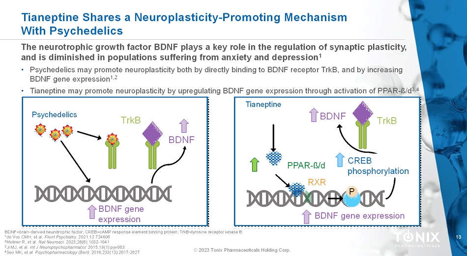 12 © 2023 Tonix Pharmaceuticals Holding Corp. C N S P O R T F O L I O TNX-601 ER -Phase 2 UPLIFT* Study Design General study characteristics: • Randomized, double-blind, placebo-controlled study in Major Depressive Disorder to evaluate monotherapy with TNX-601 ER versus placebo • Parallel design with two arms –treatment with tianeptine hemioxalate 39.4 mgor placebo • U.S. sites only, completed enrollment of 132 patients Primary Endpoint: • Mean change from baseline in the Montgomery-ÅsbergDepression Rating Scale (MADRS) total score at Week 6 *ClinicalTrials.gov Identifier: NCT05686408 Abbreviations: Dx, diagnosis; ER, extended-release; F/U, follow-up; MDD, major depressive disorder; MDE, major depressive episode; N, number