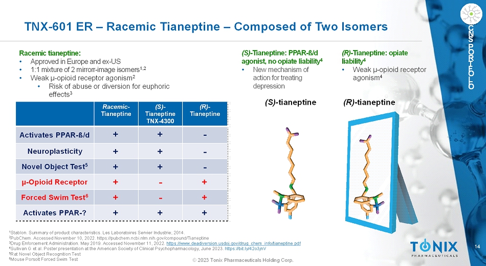 13 © 2023 Tonix Pharmaceuticals Holding Corp. The neurotrophicgrowth factor BDNF plays a key role in the regulation of synaptic plasticity, and is diminished in populations suffering from anxiety and depression 1 • Psychedelics may promote neuroplasticity both by directly binding to BDNF receptor TrkB, and by increasing BDNF gene expression 1,2 • Tianeptine may promote neuroplasticity by upregulating BDNF gene expression through activation of PPAR-ß/d 3,4 Tianeptine Shares a Neuroplasticity-Promoting Mechanism With Psychedelics BDNF=brain-derived neurotrophic factor; CREB=cAMP response element binding protein; TrkB=tyrosine receptor kinase B 1 de Vos CMH, et al. Front Psychiatry. 2021;12:724606 2 Moliner R, et al. Nat Neurosci. 2023;26(6):1032-1041 3 Ji MJ, et al. Int J Neuropsychopharmacol. 2015;19(1):pyv083 4 Seo MK, et al. Psychopharmacology (Berl). 2016;233(13):2617-2627 Tianeptine PPAR-ß/d RXR P BDNF BDNF gene expression CREB phosphorylation TrkB Psychedelics BDNF BDNF gene expression TrkB