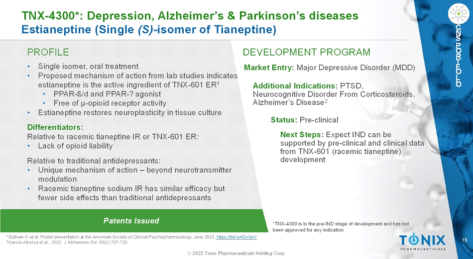 14 © 2023 Tonix Pharmaceuticals Holding Corp. C N S P O R T F O L I O TNX-601 ER –Racemic Tianeptine –Composed of Two Isomers Racemic tianeptine: • Approved in Europe and ex-US • 1:1 mixture of 2 mirrorr-image isomers 1,2 • Weak µ-opioid receptor agonism 2 • Risk of abuse or diversion for euphoric effects 3 (S)-tianeptine (R)-tianeptine 1 Stablon. Summary of product characteristics. Les LaboratoiresServierIndustrie; 2014. 2 PubChem. Accessed November 10, 2022. https://pubchem.ncbi.nlm.nih.gov/compound/Tianeptine 3 Drug Enforcement Administration. May 2019. Accessed November 11, 2022. https://www.deadiversion.usdoj.gov/drug_chem_info/tianeptine.pdf 4 Sullivan G et al. Poster presentation at the American Society of Clinical Psychopharmacology, June 2023.https://bit.ly/42o3jnV 5 Rat Novel Object Recognition Test 6 Mouse PorsoltForced Swim Test (R)- Tianeptine (S)- Tianeptine TNX-4300 Racemic- Tianeptine -++ Activates PPAR-ß/d -++ Neuroplasticity -++ Novel Object Test 5 +-+ µ-Opioid Receptor +-+ Forced Swim Test 6 +++ Activates PPAR-? (S)-Tianeptine: PPAR-ß/d agonist, no opiate liability 4 • New mechanism of action for treating depression (R)-Tianeptine: opiate liability 4 • Weak µ-opioid receptor agonism 4