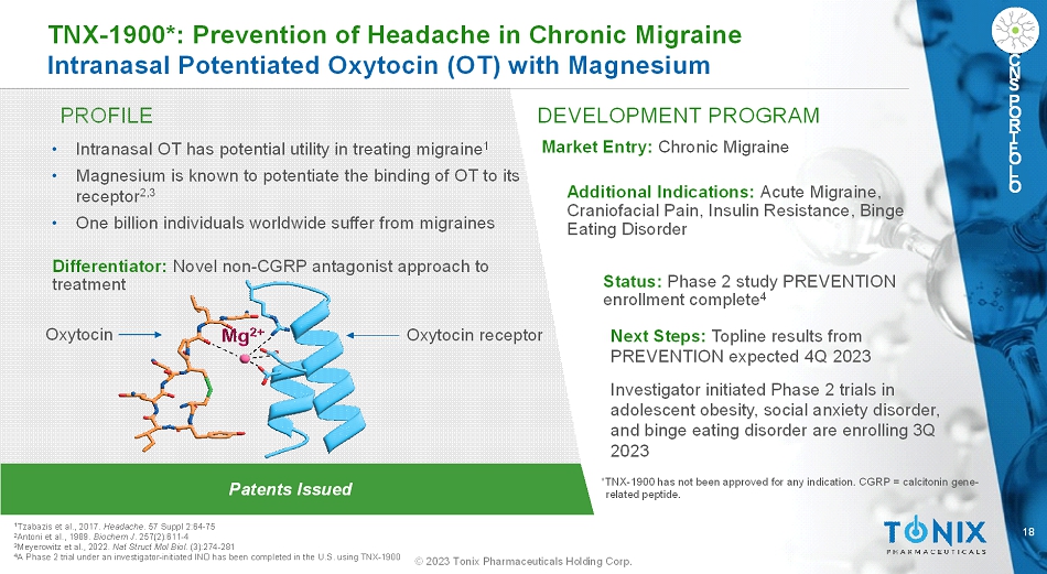 17 © 2023 Tonix Pharmaceuticals Holding Corp. Upcoming Expected Topline Results Fourth Quarter 2023 TNX-1900 for Chronic Migraine Topline Results Upcoming Phase 2 Proof-of- Concept Study Registration-Quality TNX-601 ER for Depression Topline Results Upcoming Phase 2 Proof-of- Concept Study Registration-Quality TNX-102 SL for Fibromyalgia ToplineResults Upcoming Phase 3 Potential NDA Enabling Study Registration-Quality