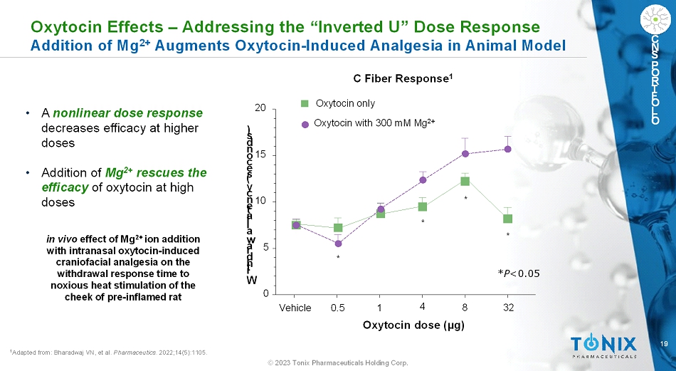 19 © 2023 Tonix Pharmaceuticals Holding Corp. C N S P O R T F O L I O 1 Adapted from: Bharadwaj VN, et al. Pharmaceutics. 2022;14(5):1105. in vivoeffect of Mg 2+ ion addition with intranasal oxytocin-induced craniofacial analgesia on the withdrawal response time to noxious heat stimulation of the cheek of pre-inflamed rat Vehicle 0.5 1 4 8 32 0 5 10 15 20 Oxytocin only Oxytocin with 300 mM Mg 2+ * * * * Oxytocin dose (µg) W i t h d r a w a l l a t e n c y ( s e c o n d s ) C Fiber Response 1 *P<0.05 Oxytocin Effects –Addressing the “Inverted U” Dose Response Addition of Mg 2+ Augments Oxytocin-Induced Analgesia in Animal Model • A nonlinear dose response decreases efficacy at higher doses • Addition of Mg 2+ rescues the efficacy of oxytocin at high doses