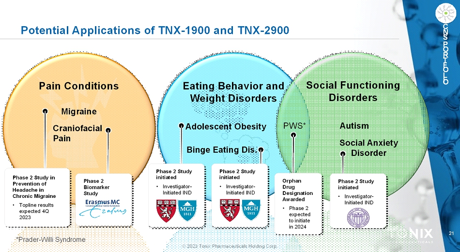 20 © 2023 Tonix Pharmaceuticals Holding Corp. C N S P O R T F O L I O TNX-1900: Phase 2 PREVENTION Study Design General study characteristics: • Randomized, double-blind, placebo-controlled study (three arms–two treatment regimens and one placebo) in chronic migraine • U.S. sites only • Fully enrolled with 88 patients • Topline results expected 4Q’23 Primary Endpoint: • Meanchange in the number of migraine headache days between the 28-day Run-In phase and the last 28-days of the Treatment phase (TNX-1900 vs. placebo) ClinicalTrials.gov Identifier: NCT05679908 A Study to Evaluate the Efficacy and Safety of TNX-1900 in Patients With ChronicMigraine(PREVENTION) N = 50 N = 50 N = 50