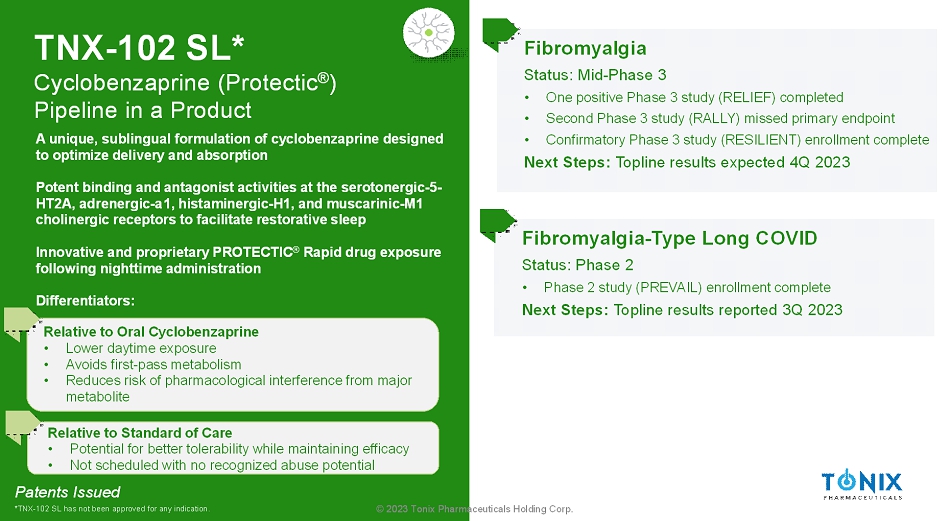 © 2023 Tonix Pharmaceuticals Holding Corp. TNX-102 SL* Cyclobenzaprine (Protectic ® ) Pipeline in a Product Fibromyalgia Status: Mid-Phase 3 • One positive Phase 3 study (RELIEF) completed • Second Phase 3 study (RALLY) missed primary endpoint • Confirmatory Phase 3 study (RESILIENT) enrollment complete Next Steps: Topline results expected 4Q 2023 Fibromyalgia-Type Long COVID Status: Phase 2 • Phase 2 study (PREVAIL) enrollment complete Next Steps: Topline results reported 3Q 2023 Patents Issued *TNX-102 SL has not been approved for any indication. A unique, sublingual formulation of cyclobenzaprine designed to optimize delivery and absorption Potent binding and antagonist activities at the serotonergic-5- HT2A, adrenergic-a1, histaminergic-H1, and muscarinic-M1 cholinergic receptors to facilitate restorative sleep Innovative and proprietary PROTECTIC ® Rapid drug exposure following nighttime administration Differentiators: Relative to Oral Cyclobenzaprine • Lower daytime exposure • Avoids first-pass metabolism • Reduces risk of pharmacological interference from major metabolite Relative to Standard of Care • Potential for better tolerability while maintaining efficacy • Not scheduled with no recognized abuse potential