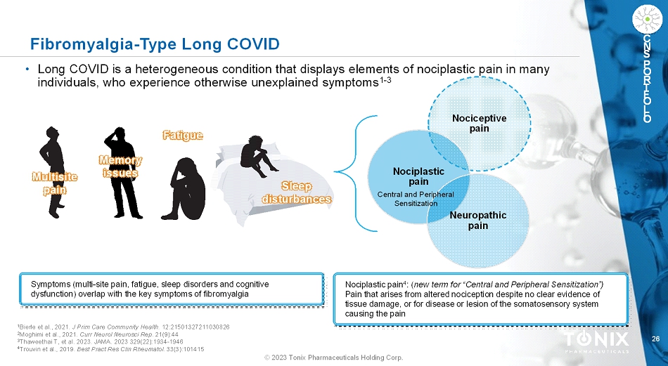 25 © 2023 Tonix Pharmaceuticals Holding Corp. C N S P O R T F O L I O TNX-102 SL: Phase 3 RESILIENTStudy Design General study characteristics: • Randomized, double-blind, placebo-controlled study in fibromyalgia • U.S. sites only, completed enrollment of 457 patients Primary Endpoint: • Daily diary pain severity score change from baseline to Week 14 (TNX-102 SL vs. placebo) • Weekly averages of the daily numerical rating scale scores Key Secondary Endpoints: • Fibromyalgia Impact Questionnaire -Revised (FIQ-R) Symptom Domain score • Patient Global Impression of Change responder analysis • FIQ-R Function Domain score • PROMIS Sleep Disturbance instrument • PROMIS Fatigue instrument • Weekly average of the daily diary assessment of sleep quality Placebo once-daily at bedtime 14 weeks TNX-102 SL once-daily at bedtime 5.6 mg (2 x 2.8 mg tablets) * * Two week run in at 2.8 mg dose at bedtime, followed by 12 weeks at 5.6 mg dose ClinicalTrials.gov Identifier: NCT05273749 A Phase 3 Study to Evaluate the Efficacy and Safety of TNX-102 SL Taken Daily in Patients WithFibromyalgia(RESILIENT)