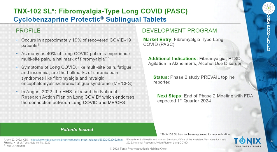 26 © 2023 Tonix Pharmaceuticals Holding Corp. C N S P O R T F O L I O Fibromyalgia-Type Long COVID • Long COVID is a heterogeneous condition that displays elements of nociplastic pain in many individuals, who experience otherwise unexplained symptoms 1-3 Symptoms (multi-site pain, fatigue, sleep disorders and cognitive dysfunction) overlap with the key symptoms of fibromyalgia Multisite pain Memory issues Fatigue Sleep disturbances 1 Bierle et al., 2021. J Prim Care Community Health. 12:21501327211030826 2 Moghimi et al., 2021. CurrNeurol NeurosciRep. 21(9):44 3 ThaweethaiT, et al. 2023. JAMA. 2023 329(22):1934-1946 4 Trouvin et al., 2019. Best PractRes Clin Rheumatol. 33(3):101415 Nociceptive pain Nociplastic pain Neuropathic pain Nociplasticpain 4 : (new term for “Central and Peripheral Sensitization”) Pain that arises from altered nociception despite no clear evidence of tissue damage, or for disease or lesion of the somatosensory system causing the pain Central and Peripheral Sensitization
