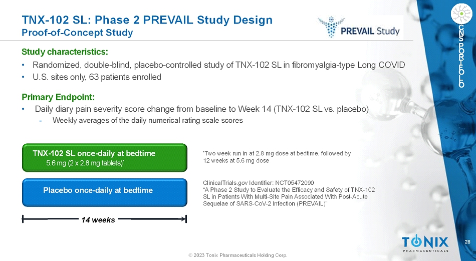 27 © 2023 Tonix Pharmaceuticals Holding Corp. C N S P O R T F O L I O PROFILE DEVELOPMENT PROGRAM Patents Issued TNX-102 SL*: Fibromyalgia-Type Long COVID (PASC) Cyclobenzaprine Protectic ® Sublingual Tablets • Occurs in approximately 19% of recovered COVID-19 patients 1 • As many as 40% of Long COVID patients experience multi-site pain, a hallmark of fibromyalgia 2,3 • Symptoms of Long COVID, like multi-site pain, fatigue and insomnia, are the hallmarks of chronic pain syndromes like fibromyalgia and myalgic encephalomyelitis/chronic fatigue syndrome (ME/CFS) • In August 2022, the HHS released the National Research Action Plan on Long COVID 4 which endorses the connection between Long COVID and ME/CFS Market Entry: Fibromyalgia-TypeLong COVID (PASC) Status:Phase 2 study PREVAIL topline reported Next Steps: End of Phase 2 Meeting with FDA expected 1 st Quarter 2024 1 June 22, 2022-CDC -https://www.cdc.gov/nchs/pressroom/nchs_press_releases/2022/20220622.htm 2 Harris, H, et al. Tonix data on file. 2022 3 TriNetX Analytics *TNX-102 SL has not been approved for any indication. C N S P O R T F O L I O Additional Indications:Fibromyalgia, PTSD, Agitation in Alzheimer’s, Alcohol Use Disorder 4 Department of Health and Human Services, Office of the Assistant Secretary for Health. 2022. National Research Action Plan on Long COVID.