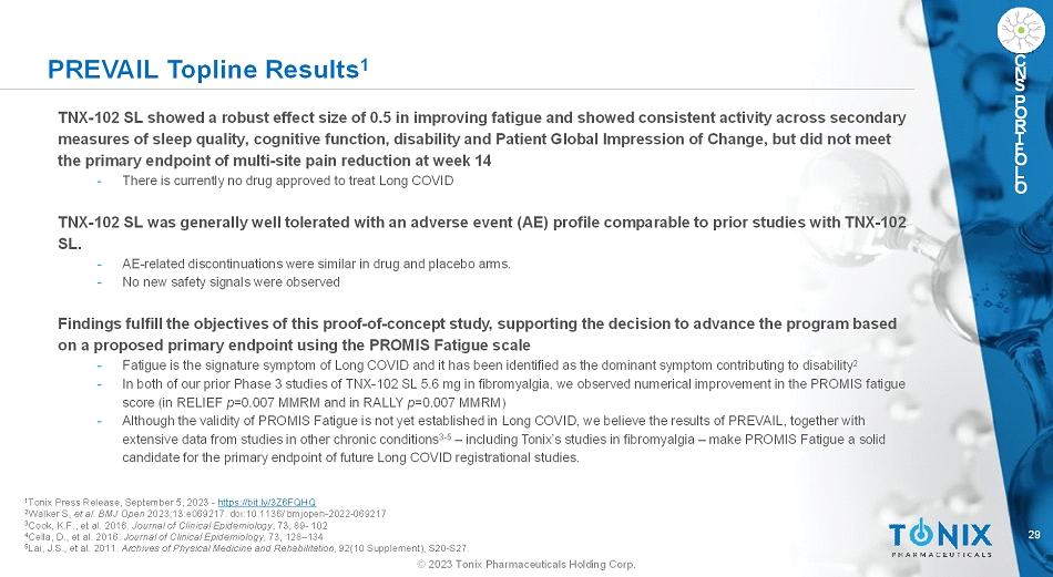 28 © 2023 Tonix Pharmaceuticals Holding Corp. C N S P O R T F O L I O TNX-102 SL: Phase 2 PREVAIL Study Design Proof-of-Concept Study Study characteristics: • Randomized, double-blind, placebo-controlled study of TNX-102 SL in fibromyalgia-type Long COVID • U.S. sites only, 63 patients enrolled Primary Endpoint: • Daily diary pain severity score change from baseline to Week 14 (TNX-102 SL vs. placebo) - Weekly averages of the daily numerical rating scale scores Placebo once-daily at bedtime 14 weeks TNX-102 SL once-daily at bedtime 5.6 mg (2 x 2.8 mg tablets) * * Two week run in at 2.8 mg dose at bedtime, followed by 12 weeks at 5.6 mg dose ClinicalTrials.gov Identifier: NCT05472090 “A Phase 2 Study to Evaluate the Efficacy and Safety ofTNX-102 SLin Patients With Multi-Site Pain Associated With Post-Acute Sequelae of SARS-CoV-2 Infection (PREVAIL)”