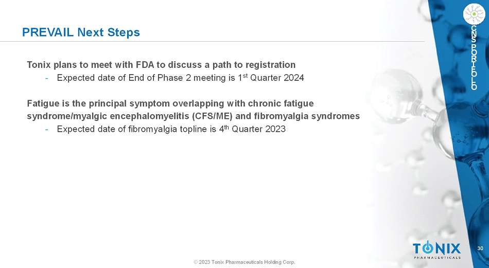 29 © 2023 Tonix Pharmaceuticals Holding Corp. C N S P O R T F O L I O PREVAIL Topline Results 1 TNX-102 SL showed a robust effect size of 0.5 in improving fatigue and showed consistent activity across secondary measures of sleep quality, cognitive function, disability and Patient Global Impression of Change, but did not meet the primary endpoint of multi-site pain reduction at week 14 - There is currently no drug approved to treat Long COVID TNX-102 SL was generally well tolerated with an adverse event (AE) profile comparable to prior studies with TNX-102 SL. - AE-related discontinuations were similar in drug and placebo arms. - No new safety signals were observed Findings fulfill the objectives of this proof-of-concept study, supporting the decision to advance the program based on a proposed primary endpoint using the PROMIS Fatigue scale - Fatigue is the signature symptom of Long COVID and it has been identified as the dominant symptom contributing to disability 2 - In both of our prior Phase 3 studies of TNX-102 SL 5.6 mg in fibromyalgia, we observed numerical improvement in the PROMIS fatigue score (in RELIEF p=0.007 MMRM and in RALLY p=0.007 MMRM) - Although the validity of PROMIS Fatigue is not yet established in Long COVID, we believe the results of PREVAIL, together with extensive data from studies in other chronic conditions 3-5 –including Tonix’sstudies in fibromyalgia –make PROMIS Fatigue a solid candidate for the primary endpoint of future Long COVID registrational studies. 1 Tonix Press Release, September 5, 2023 -https://bit.ly/3Z6FQHQ 2 Walker S, et al. BMJ Open 2023;13:e069217. doi:10.1136/ bmjopen-2022-069217 3 Cook, K.F., et al. 2016. Journal of Clinical Epidemiology, 73, 89-102 4 Cella, D., et al. 2016. Journal of Clinical Epidemiology, 73, 128–134 5 Lai, J.S., et al. 2011. Archives of Physical Medicine and Rehabilitation, 92(10 Supplement), S20-S27.