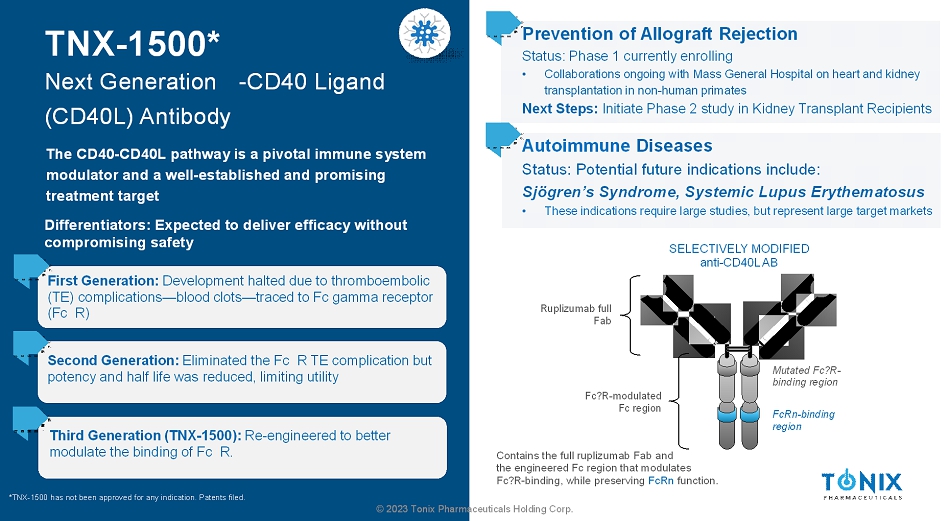 © 2023 Tonix Pharmaceuticals Holding Corp. TNX-1500* Next Generation -CD40 Ligand (CD40L) Antibody The CD40-CD40L pathway is a pivotal immune system modulator and a well-established and promising treatment target First Generation: Development halted due to thromboembolic (TE) complications—blood clots—traced to Fc gamma receptor (Fc R) Prevention of Allograft Rejection Status: Phase 1 currently enrolling • Collaborations ongoing with Mass General Hospital on heart and kidney transplantation in non-human primates Next Steps: Initiate Phase 2 study in Kidney Transplant Recipients SELECTIVELY MODIFIED anti-CD40L AB Ruplizumab full Fab Contains the full ruplizumab Fab and the engineered Fc region that modulates Fc?R-binding, while preserving FcRnfunction. Mutated Fc?R- binding region FcRn-binding region Fc?R-modulated Fc region Second Generation: Eliminated the Fc R TE complication but potency and half life was reduced, limiting utility Third Generation (TNX-1500): Re-engineered to better modulate the binding of Fc R. *TNX-1500 has not been approved for any indication. Patents filed. Differentiators: Expected to deliver efficacy without compromising safety Autoimmune Diseases Status: Potential future indications include: Sjögren’sSyndrome, Systemic Lupus Erythematosus • These indications require large studies, but represent large target markets