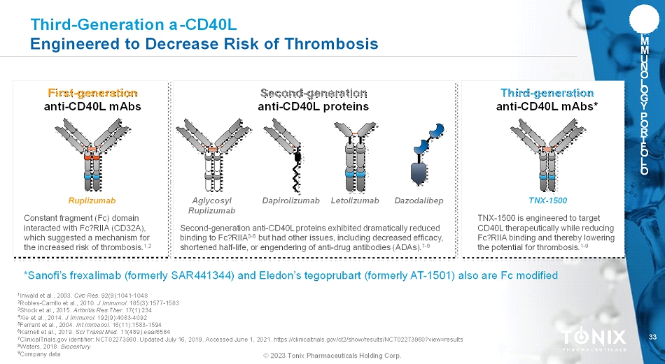 33 © 2023 Tonix Pharmaceuticals Holding Corp. I M M U N O L O G Y P O R T F O L I O Third-Generation a-CD40L Engineered to Decrease Risk of Thrombosis First-generation anti-CD40L mAbs Constant fragment (Fc) domain interacted with Fc?RIIA(CD32A), which suggested a mechanism for the increased risk of thrombosis. 1,2 Ruplizumab Second-generation anti-CD40L proteins Second-generation anti-CD40L proteins exhibited dramatically reduced binding to Fc?RIIA 3-6 but had other issues, including decreased efficacy, shortened half-life, or engendering of anti-drug antibodies (ADAs). 7-9 Dapirolizumab LetolizumabAglycosyl Ruplizumab Third-generation anti-CD40L mAbs* TNX-1500 is engineered to target CD40L therapeutically while reducing Fc?RIIAbinding and thereby lowering the potential for thrombosis. 1-9 TNX-1500 *Sanofi’s frexalimab(formerly SAR441344) and Eledon’stegoprubart(formerly AT-1501) also are Fc modified 1 Inwald et al., 2003. Circ Res. 92(9):1041-1048 2 Robles-Carrillo et al., 2010. J Immunol. 185(3):1577-1583 3 Shock et al., 2015. Arthritis Res Ther. 17(1):234 4 Xie et al., 2014. J Immunol. 192(9):4083-4092 5 Ferrant et al., 2004. Int Immunol. 16(11):1583-1594 6 Karnell et al., 2019. Sci TranslMed.11(489):eaar6584 7 ClinicalTrials.gov identifier: NCT02273960. Updated July 16, 2019. Accessed June 1, 2021. https://clinicaltrials.gov/ct2/show/results/NCT02273960?view=results 8 Waters, 2018. Biocentury. 9 Companydata Dazodalibep