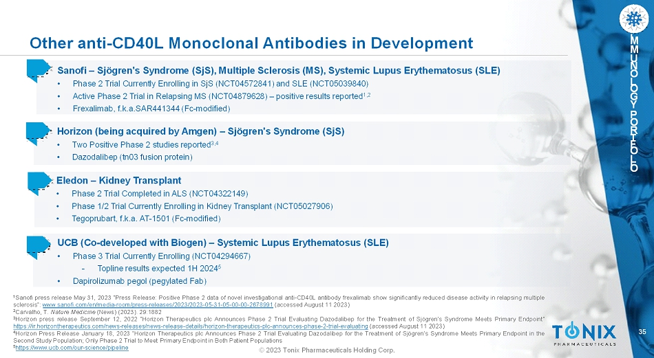 34 © 2023 Tonix Pharmaceuticals Holding Corp. I M M U N O L O G Y P O R T F O L I O TNX-1500 anti-CD40L Monoclonal Antibody 1 Lassiter,G.,etal.(2023).TNX-1500,acrystallizablefragment–modifiedanti-CD154antibody,prolongsnon-humanprimaterenalallograftsurvival.AmericanJournalofTransplantation.April3, 2023.https://doi.org/10.1016/j.ajt.2023.03.022 2 Miura,S.,etal.(2023)TNX-1500,acrystallizablefragment–modifiedanti-CD154antibody,prolongsnon-humanprimatecardiacallograftsurvival.AmericanJournalofTransplantation.April6, 2023.https://doi.org/10.1016/j.ajt.2023.03.025 Proposed indication -prevention of rejection in kidney transplant: • Supported by pre-clinical studies Phase 1 study initiated: • A Phase 1 study of TNX-1500 was initiated in the third quarter of 2023. Peer reviewed articles: • Two articles have recently published in the American Journal of Transplantationthat demonstrate TNX-1500 prolongs non-human primate renal and heart allograft survival. 1,2