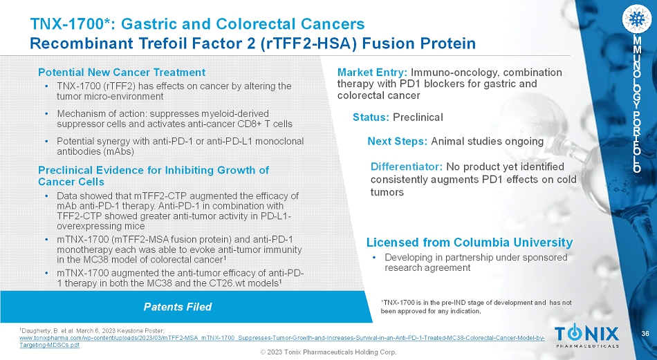 36 © 2023 Tonix Pharmaceuticals Holding Corp. I M M U N O L O G Y P O R T F O L I O Patents Filed TNX-1700*: Gastric and Colorectal Cancers Recombinant Trefoil Factor 2 (rTFF2-HSA) Fusion Protein Potential New Cancer Treatment • TNX-1700 (rTFF2) has effects on cancer by altering the tumor micro-environment • Mechanism of action: suppresses myeloid-derived suppressor cells and activates anti-cancer CD8+ T cells • Potential synergy with anti-PD-1 or anti-PD-L1 monoclonal antibodies (mAbs) Preclinical Evidence for Inhibiting Growth of Cancer Cells • Data showed that mTFF2-CTP augmented the efficacy of mAbanti-PD-1 therapy. Anti-PD-1 in combination with TFF2-CTP showed greater anti-tumor activity in PD-L1- overexpressing mice • mTNX-1700 (mTFF2-MSA fusion protein) and anti-PD-1 monotherapy each was able to evoke anti-tumor immunity in the MC38 model of colorectal cancer 1 • mTNX-1700 augmented the anti-tumor efficacy of anti-PD- 1 therapy in both the MC38 and the CT26.wt models 1 Market Entry: Immuno-oncology, combination therapy with PD1 blockers for gastric and colorectal cancer Status: Preclinical Next Steps: Animal studies ongoing *TNX-1700 is in the pre-IND stage of development and has not been approved for any indication. Differentiator: No product yet identified consistently augments PD1 effects on cold tumors Licensed from Columbia University • Developing in partnership under sponsored research agreement 1 Daugherty, B. et al. March 6, 2023 Keystone Poster; www.tonixpharma.com/wp-content/uploads/2023/03/mTFF2-MSA_mTNX-1700_Suppresses-Tumor-Growth-and-Increases-Survival-in-an-Anti-PD-1-Treated-MC38-Colorectal-Cancer-Model-by- Targeting-MDSCs.pdf