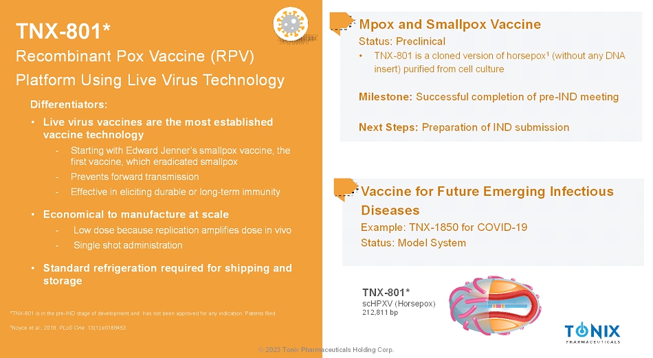 © 2023 Tonix Pharmaceuticals Holding Corp. TNX-801* Recombinant Pox Vaccine (RPV) PlatformUsing Live Virus Technology Mpoxand Smallpox Vaccine Status: Preclinical • TNX-801 is a cloned version of horsepox 1 (without any DNA insert) purified from cell culture Milestone:Successful completion of pre-IND meeting Next Steps:Preparation of IND submission Vaccine for Future Emerging Infectious Diseases Example: TNX-1850 for COVID-19 Status: Model System *TNX-801 is in the pre-IND stage of development and has not been approved for any indication. Patents filed. • Live virus vaccines are the most established vaccine technology - Starting with Edward Jenner’s smallpox vaccine, the first vaccine, which eradicated smallpox - Prevents forward transmission - Effective in eliciting durable or long-term immunity • Economical to manufacture at scale - Low dose because replication amplifies dose in vivo - Single shot administration • Standard refrigeration required for shipping and storage 1 Noyce et al., 2018. PLoSOne. 13(1):e0188453. Differentiators: TNX-801* scHPXV (Horsepox) 212,811 bp