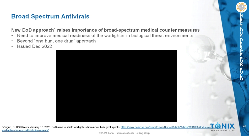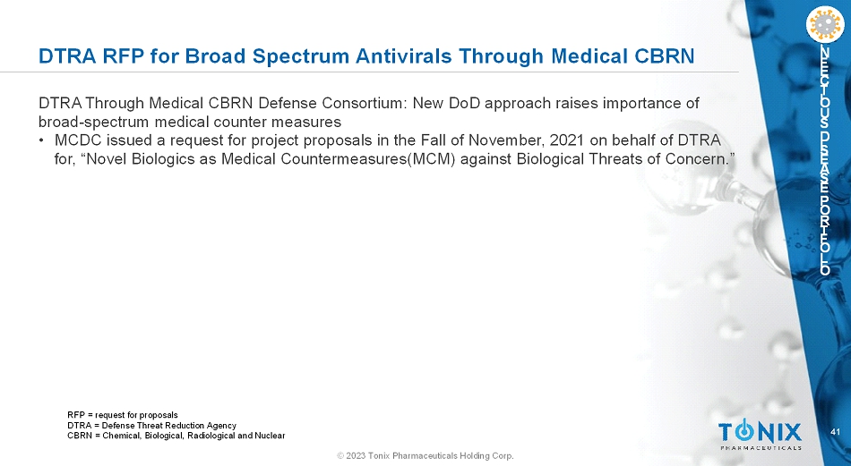 40 © 2023 Tonix Pharmaceuticals Holding Corp. I N F E C T I O U S D I S E A S E P O R T F O L I O Broad Spectrum Antivirals New DoD approach 1 raises importance of broad-spectrum medical counter measures • Need to improve medical readiness of the warfighter in biological threat environments • Beyond “one bug, one drug” approach • Issued Dec 2022 FOR OFFICIAL USE ONLY 0 Chemical and Biological Defense Program Approach for Research, Development, and Acquisition of Medical Countermeasure and Test Products 2022 UNCLASSIFIED UNCLASSIFIED CLEARED For Open Publication Department of Defense OFFICE OF PREPUBLICATION AND SECURITY REVIEW Jun 15, 2022 FOR OFFICIAL USE ONLY 0 Chemical and Biological Defense Program Approach for Research, Development, and Acquisition of Medical Countermeasure and Test Products 2022 UNCLASSIFIED UNCLASSIFIED CLEARED For Open Publication Department of Defense OFFICE OF PREPUBLICATION AND SECURITY REVIEW Jun 15, 2022 1 Vergun, D. DOD News. January 10, 2023. DoD aims to shield warfighters from novel biological agents. https://www.defense.gov/News/News-Stories/Article/Article/3261095/dod-aims-to-shield- warfighters-from-novel-biological-agents/