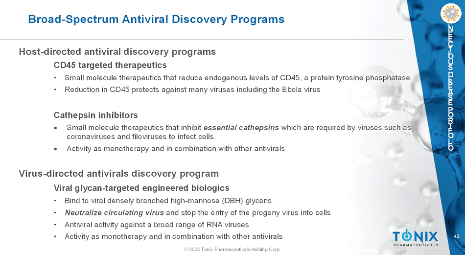 41 © 2023 Tonix Pharmaceuticals Holding Corp. I N F E C T I O U S D I S E A S E P O R T F O L I O DTRA RFP for Broad Spectrum Antivirals Through Medical CBRN DTRA Through Medical CBRN Defense Consortium: New DoD approach raises importance of broad-spectrum medical counter measures • MCDC issued a request for project proposals in the Fall of November, 2021 on behalf of DTRA for, “Novel Biologics as Medical Countermeasures(MCM) against Biological Threats of Concern.” RFP = request for proposals DTRA = Defense Threat Reduction Agency CBRN = Chemical, Biological, Radiological and Nuclear