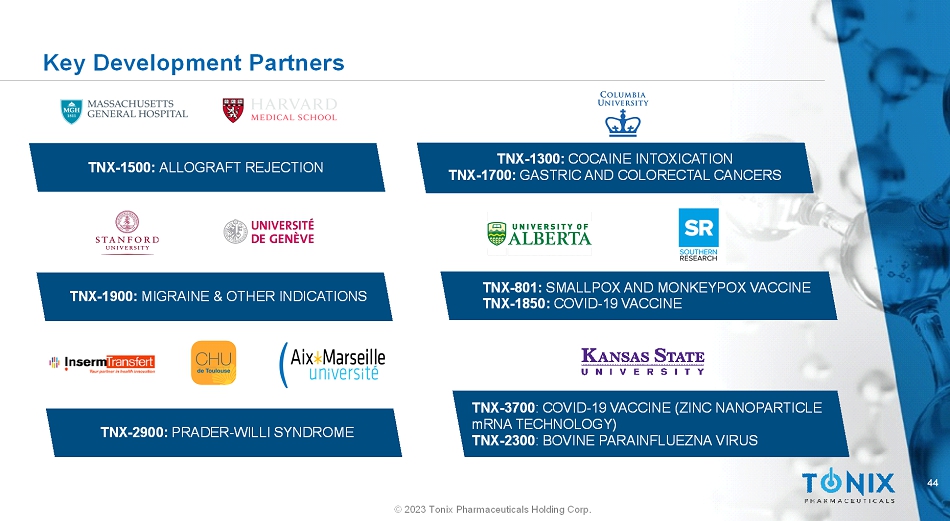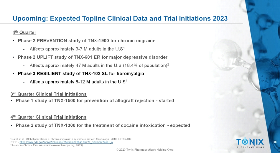 44 © 2023 Tonix Pharmaceuticals Holding Corp. TNX-1300: COCAINE INTOXICATION TNX-1700: GASTRIC AND COLORECTAL CANCERS Key Development Partners TNX-1500: ALLOGRAFT REJECTION TNX-1900: MIGRAINE & OTHER INDICATIONS TNX-801: SMALLPOX AND MONKEYPOX VACCINE TNX-1850: COVID-19 VACCINE TNX-2900: PRADER-WILLI SYNDROME TNX-3700: COVID-19 VACCINE (ZINC NANOPARTICLE mRNA TECHNOLOGY) TNX-2300: BOVINE PARAINFLUEZNA VIRUS