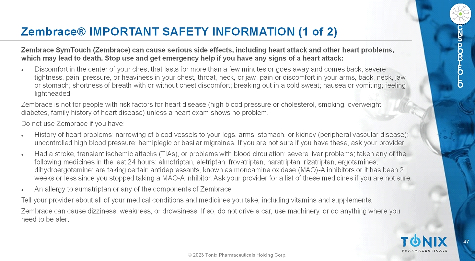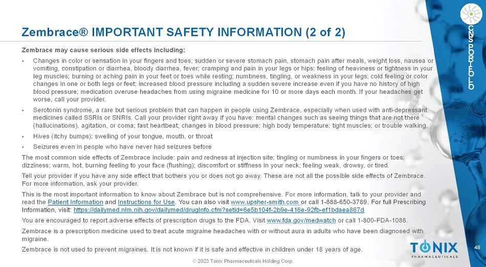 47 © 2023 Tonix Pharmaceuticals Holding Corp. C N S P O R T F O L I O Zembrace® IMPORTANT SAFETY INFORMATION(1 of 2) ZembraceSymTouch(Zembrace) can cause serious side effects, including heart attack and other heart problems, which may lead to death. Stop use and get emergency help if you have any signs of a heart attack:  Discomfort in the center of your chest that lasts for more than a few minutes or goes away and comes back; severe tightness, pain, pressure, or heaviness in your chest, throat, neck, or jaw; pain or discomfort in your arms, back, neck, jaw or stomach; shortness of breath with or without chest discomfort; breaking out in a cold sweat; nausea or vomiting; feeling lightheaded Zembraceis not for people with risk factors for heart disease (high blood pressure or cholesterol, smoking, overweight, diabetes, family history of heart disease) unless a heart exam shows no problem. Do not use Zembraceif you have:  History of heart problems; narrowing of blood vessels to your legs, arms, stomach, or kidney (peripheral vascular disease); uncontrolled high blood pressure; hemiplegic or basilar migraines. If you are not sure if you have these, ask your provider.  Had a stroke, transient ischemic attacks (TIAs), or problems with blood circulation; severe liver problems; taken any of the following medicines in the last 24 hours: almotriptan, eletriptan, frovatriptan, naratriptan, rizatriptan, ergotamines, dihydroergotamine; are taking certain antidepressants, known as monoamine oxidase (MAO)-A inhibitors or it has been 2 weeks or less since you stopped taking a MAO-A inhibitor. Ask your provider for a list of these medicines if you are not sure.  An allergy to sumatriptan or any of the components of Zembrace Tell your provider about all of your medical conditions and medicines you take, including vitamins and supplements. Zembracecan cause dizziness, weakness, or drowsiness. If so, do not drive a car, use machinery, or do anything where you need to be alert.