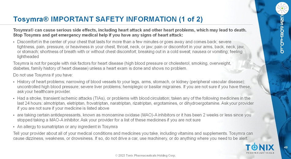 48 © 2023 Tonix Pharmaceuticals Holding Corp. C N S P O R T F O L I O Zembrace® IMPORTANT SAFETY INFORMATION(2 of 2) Zembracemay cause serious side effects including: • Changes in color or sensation in your fingers and toes; sudden or severe stomach pain, stomach pain after meals, weight loss, nausea or vomiting, constipation or diarrhea, bloody diarrhea, fever; cramping and pain in your legs or hips; feeling of heaviness or tightness in your leg muscles; burning or aching pain in your feet or toes while resting; numbness, tingling, or weakness in your legs; cold feeling or color changes in one or both legs or feet; increased blood pressure including a sudden severe increase even if you have no history of high blood pressure; medication overuse headaches from using migraine medicine for 10 or more days each month. If your headaches get worse, call your provider. • Serotonin syndrome, a rare but serious problem that can happen in people using Zembrace, especially when used with anti-depressant medicines called SSRIs or SNRIs. Call your provider right away if you have: mental changes such as seeing things that are not there (hallucinations), agitation, or coma; fast heartbeat; changes in blood pressure; high body temperature; tight muscles; or trouble walking. • Hives (itchy bumps); swelling of your tongue, mouth, or throat • Seizures even in people who have never had seizures before The most common side effects of Zembraceinclude: pain and redness at injection site; tingling or numbness in your fingers or toes; dizziness; warm, hot, burning feeling to your face (flushing); discomfort or stiffness in your neck; feeling weak, drowsy, or tired. Tell your provider if you have any side effect that bothers you or does not go away. These are not all the possible side effectsof Zembrace. For more information, ask your provider. This is the most important information to know about Zembracebut is not comprehensive. For more information, talk to your provider and read the Patient Informationand Instructions for Use. You can also visit www.upsher-smith.comor call 1-888-650-3789. For full Prescribing Information, visit: https://dailymed.nlm.nih.gov/dailymed/drugInfo.cfm?setid=6e5b104f-2b9e-416e-92fb-ef1bdaea867d You are encouraged to report adverse effects of prescription drugs to the FDA. Visit www.fda.gov/medwatchor call 1-800-FDA-1088. Zembraceis a prescription medicine used to treat acute migraine headaches with or without aura in adults who have been diagnosed with migraine. Zembraceis not used to prevent migraines. It is not known if it is safe and effective in children under 18 years of age.
