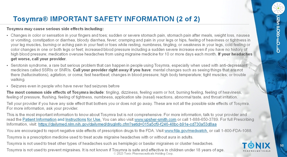 49 © 2023 Tonix Pharmaceuticals Holding Corp. C N S P O R T F O L I O Tosymra®IMPORTANT SAFETY INFORMATION(1 of 2) Tosymra® can cause serious side effects, including heart attack and other heart problems, which may lead to death. Stop Tosymra and get emergency medical help if you have any signs of heart attack: • Discomfortinthecenterofyourchestthatlastsformorethanafewminutes orgoes away and comes back; severe tightness,pain,pressure,orheavinessinyourchest,throat,neck,orjaw; painordiscomfortinyourarms,back, neck,jaw, orstomach; shortnessofbreathwithorwithoutchestdiscomfort; breakingout inacoldsweat; nauseaorvomiting; feeling lightheaded Tosymraisnotforpeoplewithriskfactorsforheartdisease(highbloodpressureor cholesterol,smoking,overweight, diabetes,familyhistoryofheartdisease)unlessa heart exam is done and shows no problem. DonotuseTosymraifyouhave: • Historyof heartproblems; narrowingofbloodvesselstoyourlegs,arms,stomach,orkidney(peripheral vascular disease); uncontrolledhighblood pressure; severeliverproblems; hemiplegicorbasilarmigraines.Ifyouarenotsureifyouhavethese, askyourhealthcare provider. • Hadastroke,transientischemicattacks(TIAs),orproblemswithbloodcirculation; takenanyofthefollowingmedicinesinthe last24hours:almotriptan, eletriptan, frovatriptan, naratriptan, rizatriptan, ergotamines, ordihydroergotamine. Askyourprovider ifyouarenotsureifyourmedicineis listedabove • aretakingcertainantidepressants,knownasmonoamineoxidase(MAO)-Ainhibitorsor it has been 2 weeks or less since you stopped taking a MAO-Ainhibitor. Ask your provider for a list of these medicines if you are notsure • AnallergytosumatriptanoranyingredientinTosymra Tellyourprovideraboutallofyourmedicalconditions andmedicinesyoutake,including vitamins and supplements. Tosymracan causedizziness,weakness,ordrowsiness. Ifso,donotdriveacar,use machinery, or do anything where you need to be alert.