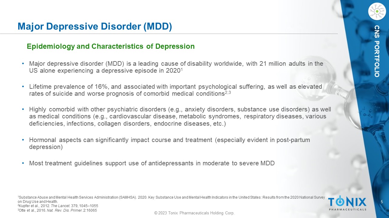 4 © 2023 Tonix Pharmaceuticals Holding Corp. CNS PORTFOLIO TNX - 601 ER - Phase 2 UPLIFT* Study Design General s tudy c haracteristics: • Randomized, double - blind, placebo - controlle d study in Major Depressive Disorder to evaluate monotherapy with TNX - 601 ER versus placebo • Parallel design with two arms – treatment with tianeptine hemioxalate 39.4 mg or placebo • U.S. sites only, completed enrollment of 132 patients • Clinical phase completed – announced October 16, 2023 1 Primary Endpoint: • Mean change from baseline in the Montgomery - Åsberg Depression Rating Scale (MADRS) total score at Week 6 • Threshold for achieving positive proof - of - concept study is effect size (ES) > 0.20 • Threshold for positive pivotal study is p - value < 0.05 *ClinicalTrials.gov Identifier: NCT05686408 Abbreviations: Dx, diagnosis; ER, extended - release; F/U, follow - up; MDD, major depressive disorder; MDE, major depressive episo de; N, number 1 Tonix Press Release, October 16 2023: https://ir.tonixpharma.com/news - events/press - releases/detail/1430/tonix - pharmaceuticals - completes - clinical - stage - of - phase - 2 Next Steps: Topline results expected 4Q 2023 (Early November)
