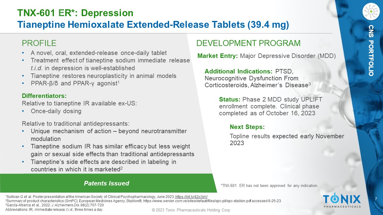 © 2023 Tonix Pharmaceuticals Holding Corp. 6 © 2023 Tonix Pharmaceuticals Holding Corp. CNS PORTFOLIO • The Sequenced Treatment Alternatives to Relieve Depression (STAR*D) study, regarded as the largest antidepressant trial ever conducted, indicated approximately 30% of depressed patients fail to achieve remission , even after multiple treatment attempts 1,2 • SSRIs are currently the most prescribed class of antidepressants, yet only about 50% of patients with MDD respond to initial SSRI treatment , and only 35 - 40% of those patients achieve full remission 1 • Antidepressant treatments often continue for years, and the side effect profiles of the monoaminergic antidepressants are intolerable to many • There is a high unmet need for new classes of antidepressants with different mechanisms of action High Unmet N eed for New C lasses of Antidepressants 1 Rush et al., 2006. Am J Psychiatry. 163:1905 – 1917 2 Rush et al., 2004. Control Clin Trials . 25(1):119 - 42