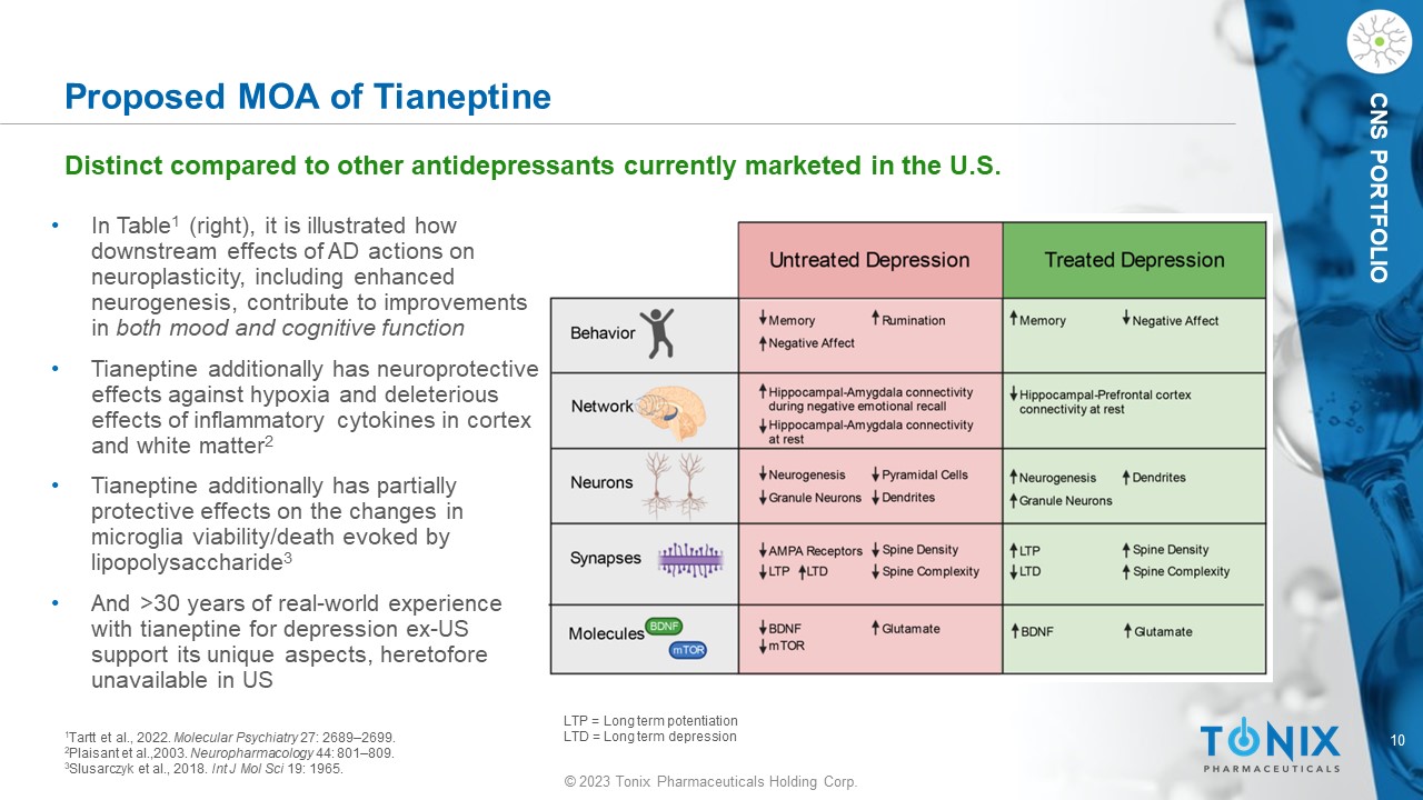 © 2023 Tonix Pharmaceuticals Holding Corp. 9 © 2023 Tonix Pharmaceuticals Holding Corp. CNS PORTFOLIO History of Tianeptine and TNX - 601 ER CNS PORTFOLIO • Tianeptine sodium (amorphous) immediate release (IR) tablets have been available in Europe and many countries in Asia and Latin America for the treatment of MDD since it was first marketed in France in 1989. Due to its short half - life, tianeptine sodium IR is taken three times daily, which is challenging for patient adherence. • Currently, there is no tianeptine - containing product approved in the U.S. and no extended - release tianeptine product approved anywhere in the world. • Tonix discovered a novel hemioxalate salt of tianeptine that may provide improved stability, consistency, and manufacturability compared to known salt forms of tianeptine. • TNX - 601 ER is taken once daily, increasing patient adherence and is thereby anticipated to improve the overall effectiveness of treatment compared to that of tianeptine sodium IR.