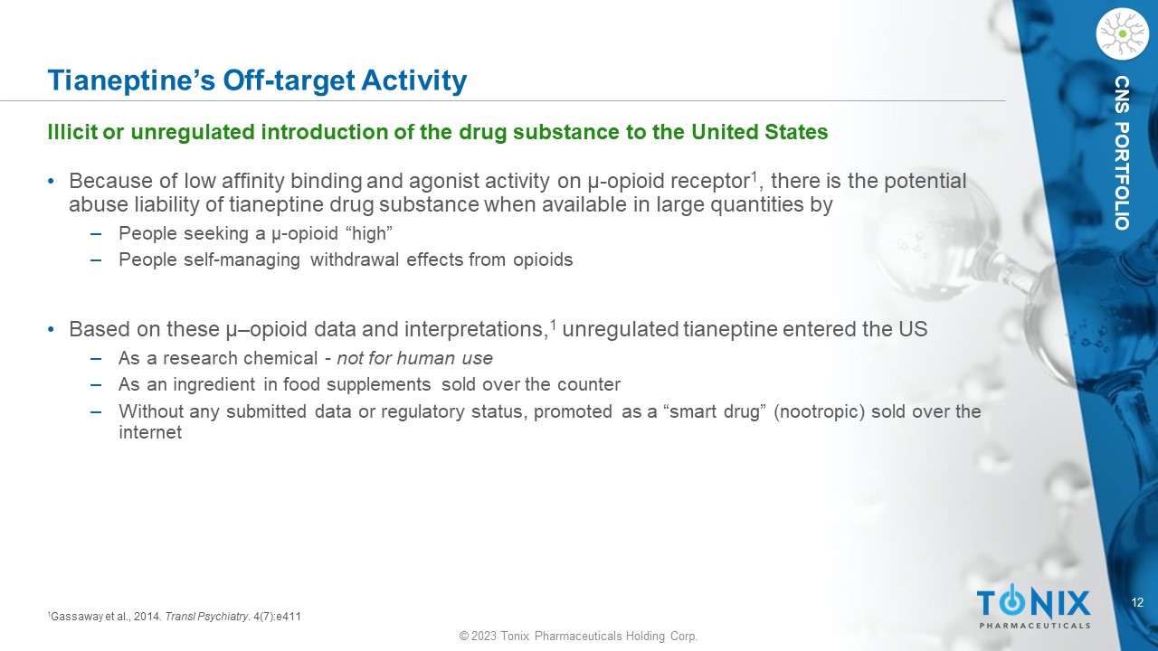 © 2023 Tonix Pharmaceuticals Holding Corp. 12 © 2023 Tonix Pharmaceuticals Holding Corp. CNS PORTFOLIO Tianeptine’s Off - target Activity • Because of low affinity binding and agonist activity on µ - opioid receptor 1 , there is the potential abuse liability of tianeptine drug substance when available in large quantities by ‒ People seeking a µ - opioid “high” ‒ People self - managing withdrawal effects from opioids • Based on these µ – opioid data and interpretations, 1 unregulated tianeptine entered the US ‒ As a research chemical - not for human use ‒ As an ingredient in food supplements sold over the counter ‒ Without any submitted data or regulatory status, promoted as a “smart drug” (nootropic) sold over the internet Illicit or unregulated introduction of the drug substance to the United States 1 Gassaway et al., 2014. Transl Psychiatry . 4(7):e411