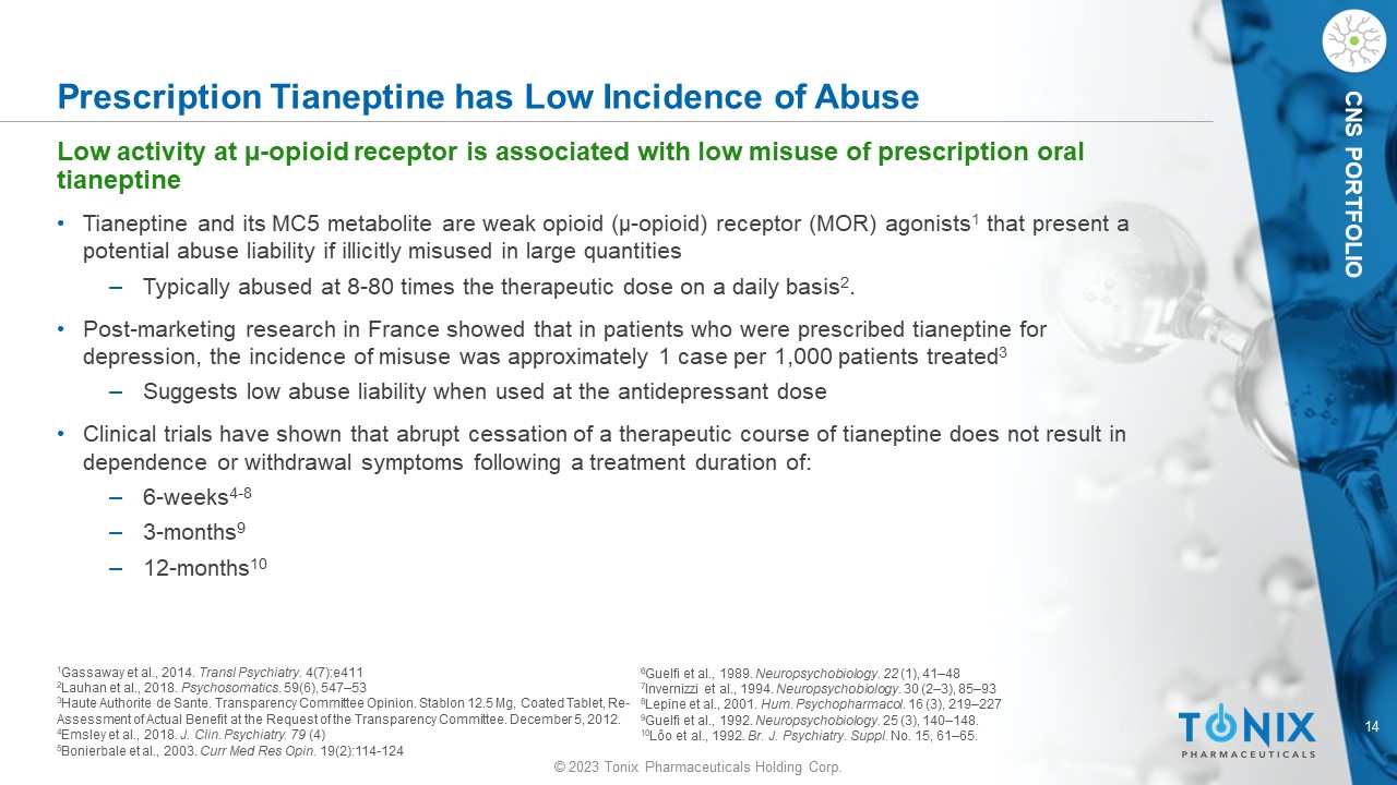 © 2023 Tonix Pharmaceuticals Holding Corp. 13 © 2023 Tonix Pharmaceuticals Holding Corp. CNS PORTFOLIO Published µ - Opioid Receptor (MOR) Binding of (R) - Methadone and Certain Potential and Approved Antidepressant Agents 1 Codd EE, et al. J Pharmacol Exp Ther . 1995 274(3):1263 - 70. PMID: 7562497. 2 pdsp.unc.edu/databases/ kidb.php 3 Roth BL et al. The Neuroscientist , 6:252 - 262, 2000 4 Science Netwatch , 28 January 2000; 287 (5453) 5 Combination with bupropion HCl 105 mg; prescribed b.i.d. 6 Fava M. et al., Am JPsychiatry . 2022 179(2):122 - 131. doi : 10.1176/appi.ajp.2021.21020197. Dextromethorphan ( ± ) Tianeptine (S) - (+) - Methadone (R) - ( - ) - Methadone API 1280 rat 1 768 human 2 19.7 rat 1 0.945 rat 1 Affinity to µ - opioid receptor, K i ( nM ) (species) 1 - 4 Auvelity ® TNX - 601 ER REL - 1017 Program Name Axsome Tonix Relmada - Sponsor MDD MDD MDD - Indication 90 mg 6 39.4 mg/day 25 or 50 mg/day N/A Antidepressant dose FDA Approved Phase 2 topline expected early Nov Recruiting for Phase 3 - Current dev. stage NMDA - R antagonist SERT inhibitor PPAR - β/δ activator NMDA receptor channel blocker 6 N/A Proposed MOA