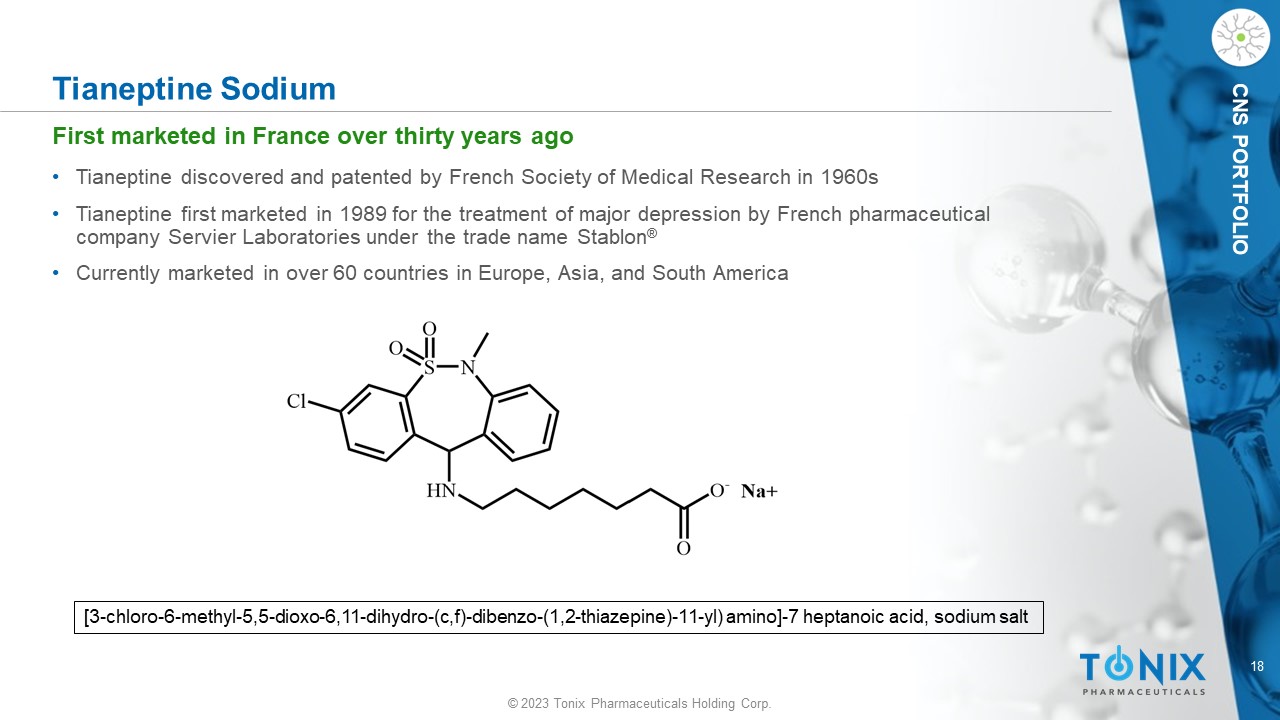 © 2023 Tonix Pharmaceuticals Holding Corp. 17 © 2023 Tonix Pharmaceuticals Holding Corp. CNS PORTFOLIO Looking Forward: Additional Potential Indications for TNX - 601 ER • Neurodegenerative disorders ‒ Parkinson’s (and associated conditions, e.g. depression and psychosis) 1 ‒ Alzheimer’s (and associated conditions, e.g. agitation, depression and psychosis) 2 • ADHD 3 • Stress disorders 4 ‒ PTSD, Anxiety • Aging/Neuroprotection 5,6 ‒ Mild Cognitive Impairment • Asthma 7 • Overlapping chronic pain syndromes ‒ Fibromyalgia 8 ‒ Irritable bowel syndrome • Addiction ‒ Opiate use disorder 9 ‒ Alcohol use disorder 1 Levin, 2007. Neurosci Behav Physiol . 37(4):419 - 24 2 García - Alberca et al., 2022. J Alzheimers Dis . 88(2):707 - 720 3 Niederhofer et al., 2004. Neuropsychobiology . 49(3): 130 - 3. 4 Krystal et al., 2009. Drug Discov Today . 14(13 - 14):690 - 697 5 Yoo et al., 2015. J Affect Disord . 185:24 - 30.6 6 Saiz - Ruiz et al., 1998. Prog. Neuro - Psychopharmacol . & Bio. Psychiat . 22(2): 319 - 329 Informed by clinical data and mechanistic insights 7 Lechin et al., 2004. Methods Find Exp Clin Pharmacol . 26(9): 697 – 701 8 “ISRCTN16400909 – Tianeptine for the treatment of fibromyalgia: a prospective double - blind, randomised , single - centre , placebo - controlled, parallel group study" . Controlled - trials.com. Archived from the original on 21 July 2010. Retrieved 13 August 2010 9 Chu et al., 2010. Behav Pharmacol . 21(5 - 6):523 - 9