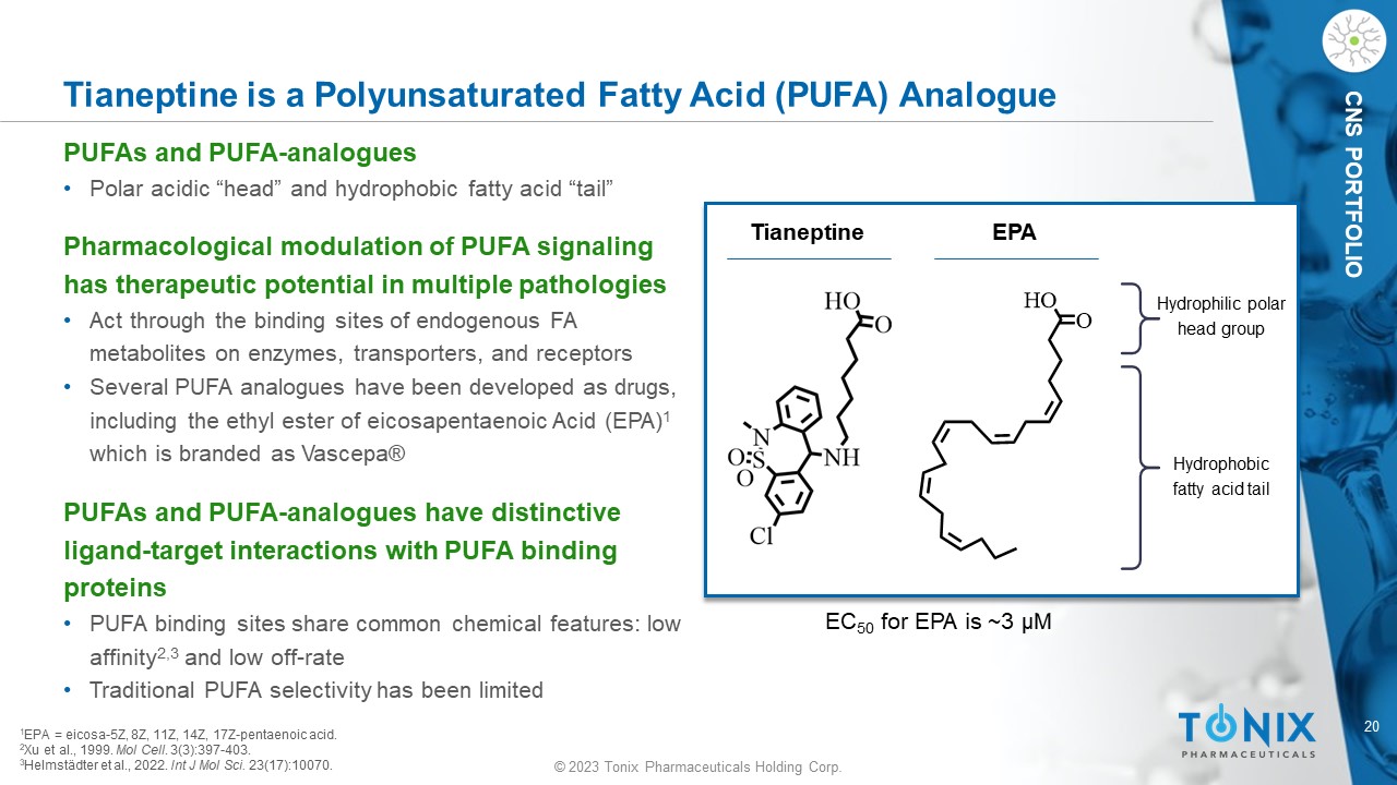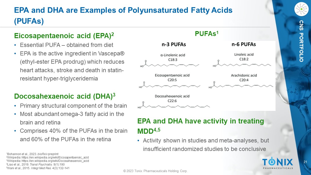 © 2023 Tonix Pharmaceuticals Holding Corp. 20 © 2023 Tonix Pharmaceuticals Holding Corp. CNS PORTFOLIO Tianeptine is a Polyunsaturated Fatty Acid (PUFA) Analogue PUFAs and PUFA - analogues • Polar acidic “head” and hydrophobic fatty acid “tail” Pharmacological modulation of PUFA signaling has therapeutic potential in multiple pathologies • Act through the binding sites of endogenous FA metabolites on enzymes, transporters, and receptors • Several PUFA analogues have been developed as drugs, including the ethyl ester of eicosapentaenoic Acid (EPA) 1 which is branded as Vascepa ® PUFAs and PUFA - analogues have distinctive ligand - target interactions with PUFA binding proteins • PUFA binding sites share common chemical features: low affinity 2,3 and low off - rate • Traditional PUFA selectivity has been limited EPA Hydrophilic polar head group Hydrophobic fatty acid tail 1 EPA = e icosa - 5Z, 8Z, 11Z, 14Z, 17Z - pentaenoic acid. 2 Xu et al., 1999. Mol Cell . 3(3):397 - 403. 3 Helmstädter et al., 2022. Int J Mol Sci. 23(17):10070. Tianeptine EC 50 for EPA is ~3 µM