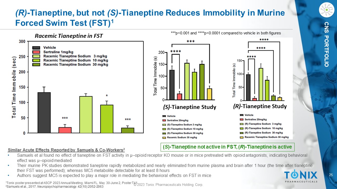 © 2023 Tonix Pharmaceuticals Holding Corp. 24 © 2023 Tonix Pharmaceuticals Holding Corp. CNS PORTFOLIO Treatment with 0.1 and 0.32 µM (S) - Tianeptine Significantly I ncreased A verage N eurite L ength 1 PBS (S) - Tianeptine 0.1 µM (R) - Tianeptine 0.1 µM Neurite network dynamics tested in plated human iPSC - derived glutamatergic neurons • Increase in average neurite length in culture for (S) - Tianeptine indicates plastogenic effects which are independent µ - opioid activity (µ - opioid activity only in (R) - isomer) • Consistent with neuroregenerative effects of tianeptine on dendritic connectivity of glutamatergic neurons in hippocampus CA3 region, identified by McEwen & Coworkers 2 1 Tonix poster presented at ASCP 2023 Annual Meeting, Miami FL, May 30 - June 2, Poster T41 2 McEwen BS, et al. Mol P sychiatry. 2010;15(3):237 - 249.