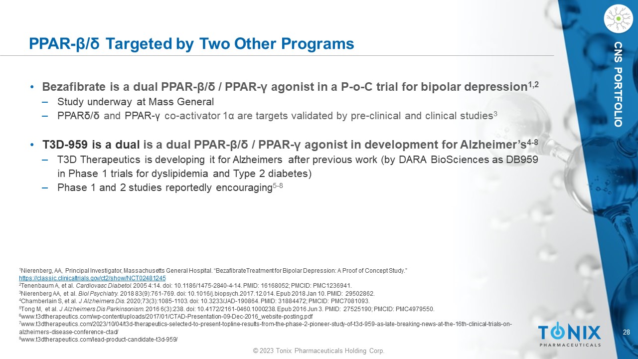 © 2023 Tonix Pharmaceuticals Holding Corp. 28 © 2023 Tonix Pharmaceuticals Holding Corp. CNS PORTFOLIO PPAR - β / δ Targeted by Two Other Programs • Bezafibrate is a dual PPAR - β /δ / PPAR - γ agonist in a P - o - C trial for bipolar depression 1,2 ‒ Study underway at Mass General ‒ PPAR δ/ δ and PPAR - γ co - activator 1 α are targets validated by pre - clinical and clinical studies 3 • T3D - 959 is a dual is a dual PPAR - β /δ / PPAR - γ agonist in development for Alzheimer’s 4 - 8 ‒ T3D Therapeutics is developing it for Alzheimers after previous work (by DARA BioSciences as DB959 in Phase 1 trials for dyslipidemia and Type 2 diabetes) ‒ Phase 1 and 2 studies reportedly encouraging 5 - 8 1 Nierenberg, AA, Principal Investigator, Massachusetts General Hospital. “ BezafibrateTreatment for Bipolar Depression: A Proof of Concept Study.” h ttps://classic.clinicaltrials.gov/ct2/show/NCT02481245 2 Tenenbaum A, et al. Cardiovasc Diabetol . 2005 4:14. doi : 10.1186/1475 - 2840 - 4 - 14. PMID: 16168052; PMCID: PMC1236941. 3 Nierenberg AA, et al. Biol Psychiatry. 2018 83(9):761 - 769. doi : 10.1016/j.biopsych.2017.12.014. Epub 2018 Jan 10. PMID: 29502862. 4 Chamberlain S, et al. J Alzheimers Dis. 2020;73(3):1085 - 1103. doi : 10.3233/JAD - 190864. PMID: 31884472; PMCID: PMC7081093. 5 Tong M, et al. J Alzheimers Dis Parkinsonism . 2016 6(3):238. doi : 10.4172/2161 - 0460.1000238. Epub 2016 Jun 3. PMID: 27525190; PMCID: PMC4979550. 6 www.t3dtherapeutics.com/wp - content/uploads/2017/01/CTAD - Presentation - 09 - Dec - 2016_website - posting.pdf 7 www.t3dtherapeutics.com/2023/10/04/t3d - therapeutics - selected - to - present - topline - results - from - the - phase - 2 - pioneer - study - of - t3d - 95 9 - as - late - breaking - news - at - the - 16th - clinical - trials - on - alzheimers - disease - conference - ctad/ 8 www.t3dtherapeutics.com/lead - product - candidate - t3d - 959/
