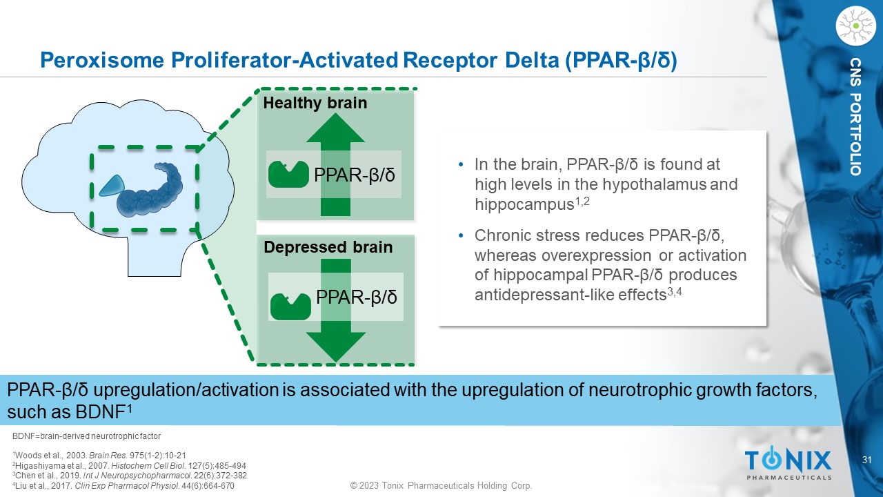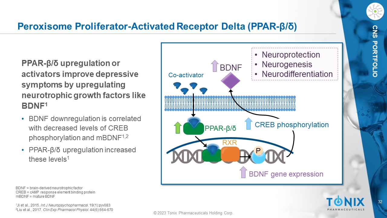 © 2023 Tonix Pharmaceuticals Holding Corp. 31 © 2023 Tonix Pharmaceuticals Holding Corp. CNS PORTFOLIO Peroxisome Proliferator - Activated Receptor Delta (PPAR - β/δ) BDNF=brain - derived neurotrophic factor 1 Woods et al., 2003. Brain Res. 975(1 - 2):10 - 21 2 Higashiyama et al., 2007. Histochem Cell Biol . 127(5):485 - 494 3 Chen et al., 2019. Int J Neuropsychopharmacol . 22(6):372 - 382 4 Liu et al., 2017. Clin Exp Pharmacol Physiol. 44(6):664 - 670 • In the brain, PPAR - β/δ is found at high levels in the hypothalamus and hippocampus 1,2 • Chronic stress reduces PPAR - β/δ, whereas overexpression or activation of hippocampal PPAR - β/δ produces antidepressant - like effects 3,4 PPAR - β/δ upregulation/activation is associated with the upregulation of neurotrophic growth factors, such as BDNF 1 PPAR - β/δ Healthy brain PPAR - β/δ Depressed brain