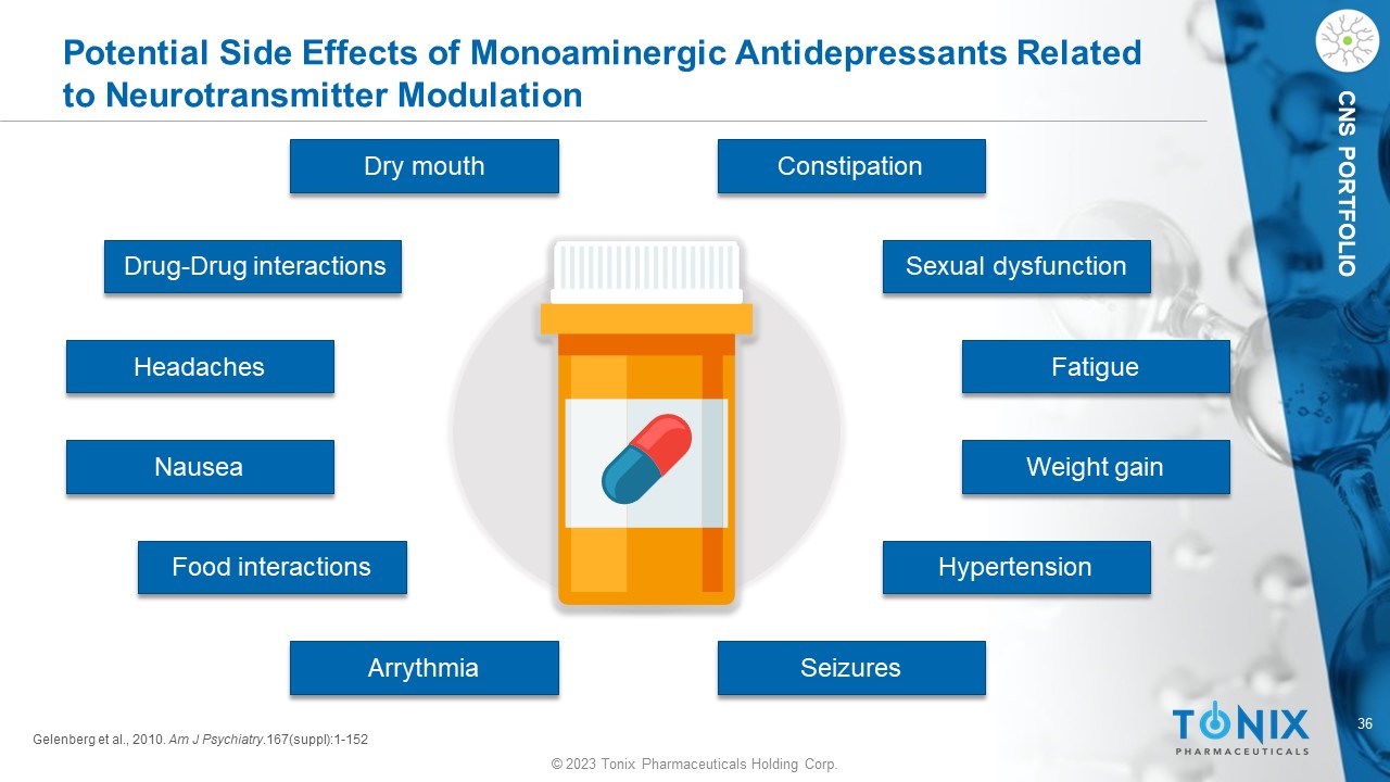 © 2023 Tonix Pharmaceuticals Holding Corp. 36 © 2023 Tonix Pharmaceuticals Holding Corp. CNS PORTFOLIO Potential Side Effects of Monoaminergic Antidepressants Related to Neurotransmitter Modulation Gelenberg et al., 2010. Am J Psychiatry .167(suppl):1 - 152 Dry mouth Headaches Nausea Hypertension Weight gain Constipation Fatigue Arrythmia Seizures Sexual dysfunction Drug - Drug interactions Food interactions