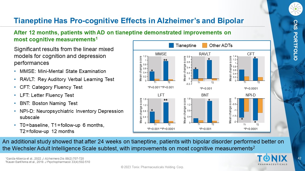 © 2023 Tonix Pharmaceuticals Holding Corp. 42 © 2023 Tonix Pharmaceuticals Holding Corp. CNS PORTFOLIO Tianeptine Has Pro - cognitive Effects in Alzheimer’s and Bipolar After 12 months, patients with AD on tianeptine demonstrated improvements on most cognitive measurements 1 1 García - Alberca et al., 2022. J Alzheimers Dis. 88(2):707 - 720 2 Kauer - Sant'Anna et al., 2019. J Psychopharmacol . 33(4):502 - 510 Significant results from the linear mixed models for cognition and depression performances • MMSE: Mini - Mental State Examination • RAVLT: Rey Auditory Verbal Learning Test • CFT: Category Fluency Test • LFT: Letter Fluency Test • BNT: Boston Naming Test • NPI - D: Neuropsychiatric Inventory Depression subscale • T0 = baseline, T1 = follow - up 6 months, T2 = follow - up 12 months An additional study showed that after 24 weeks on tianeptine, patients with bipolar disorder performed better on the Wechsler Adult Intelligence Scale subtest, with improvements on most cognitive measurements 2 Tianeptine Other ADTs 1.2 0.8 1 0.6 0.4 0.2 0 MMSE T1 T2 Mean change score * ** *P=0.001 **P<0.001 0.8 0.4 0.6 0.2 0 - 0.2 RAVLT T1 T2 Mean change score * * 1.2 0.8 1 0.6 0.4 0.2 0 CFT T1 T2 Mean change score * 1.4 Mean change score 1.2 0.8 0.4 0 LFT T1 T2 * ** 1.6 1.6 0.8 1.2 0 0.4 Mean change score BNT T1 T2 * Mean change score 0 - 0.5 - 1 - 1.5 - 2 NPI - D T1 T2 * * *P<0.001 *P<0.0001 *P<0.001 **P<0.0001 *P<0.001 *P<0.0001