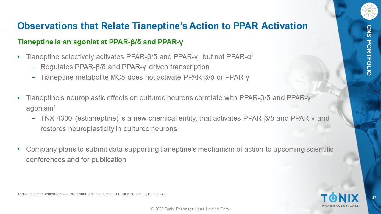 © 2023 Tonix Pharmaceuticals Holding Corp. 43 © 2023 Tonix Pharmaceuticals Holding Corp. CNS PORTFOLIO Observations that Relate Tianeptine’s Action to PPAR Activation • Tianeptine selectively activates PPAR - β / δ and PPAR - γ, but not PPAR - α 1 − Regulates PPAR - β / δ and PPAR - γ driven transcription − Tianeptine metabolite MC5 does not activate PPAR - β / δ or PPAR - γ • Tianeptine’s neuroplastic effects on cultured neurons correlate with PPAR - β / δ and PPAR - γ agonism 1 − TNX - 4300 ( estianeptine ) is a new chemical entity, that activates PPAR - β / δ and PPAR - γ and restores neuroplasticity in cultured neurons • Company plans to submit data supporting tianeptine’s mechanism of action to upcoming scientific conferences and for publication Tianeptine is an agonist at PPAR - β / δ and PPAR - γ 1 Tonix poster presented at ASCP 2023 Annual Meeting, Miami FL, May 30 - June 2, Poster T41