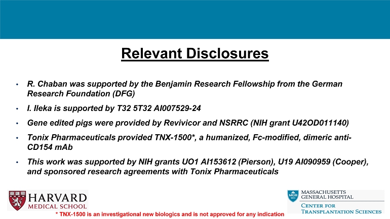 Relevant Disclosures • R. Chaban was supported by the Benjamin Research Fellowship from the German Research Foundation (DFG) • I. Ileka is supported by T32 5T32 AI007529 - 24 • Gene edited pigs were provided by Revivicor and NSRRC (NIH grant U42OD011140) • Tonix Pharmaceuticals provided TNX - 1500*, a humanized, Fc - modified, dimeric anti - CD154 mAb • This work was supported by NIH grants UO1 AI153612 (Pierson), U19 AI090959 (Cooper), and sponsored research agreements with Tonix Pharmaceuticals * TNX - 1500 is an investigational new biologics and is not approved for any indication