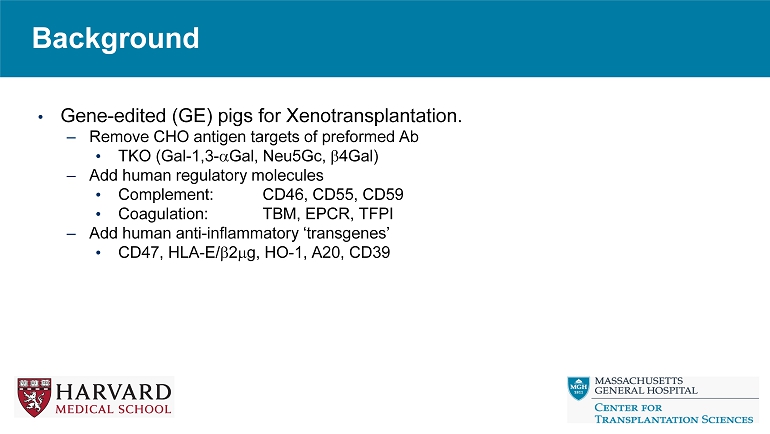 Background • Gene - edited (GE) pigs for Xenotransplantation. – Remove CHO antigen targets of preformed Ab • TKO (Gal - 1,3 - a Gal, Neu5Gc, b 4Gal) – Add human regulatory molecules • Complement: CD46, CD55, CD59 • Coagulation: TBM, EPCR, TFPI – Add human anti - inflammatory ‘transgenes’ • CD47, HLA - E/ b 2 m g, HO - 1, A20, CD39