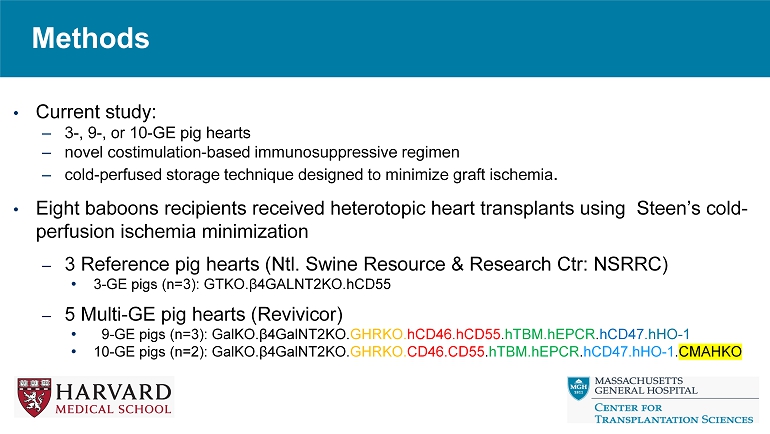 Methods • Current study: – 3 - , 9 - , or 10 - GE pig hearts – novel costimulation - based immunosuppressive regimen – cold - perfused storage technique designed to minimize graft ischemia . • Eight baboons recipients received heterotopic heart transplants using Steen’s cold - perfusion ischemia minimization – 3 Reference pig hearts ( Ntl . Swine Resource & Research Ctr: NSRRC) • 3 - GE pigs (n=3): GTKO. β4 GALNT2KO.hCD55 – 5 Multi - GE pig hearts ( Revivicor ) • 9 - GE pigs (n=3): GalKO . β4 GalNT2KO. GHRKO. hCD46.hCD55 . hTBM.hEPCR . hCD47 .hHO - 1 • 10 - GE pigs (n=2): GalKO . β4 GalNT2KO. GHRKO. CD46.CD55 . hTBM.hEPCR . hCD47.hHO - 1 . CMAHKO