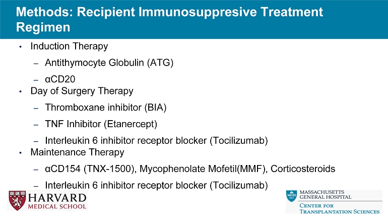 Methods: Recipient Immunosuppresive Treatment Regimen • Induction Therapy – Antithymocyte Globulin (ATG) – α CD20 • Day of Surgery Therapy – Thromboxane inhibitor (BIA) – TNF Inhibitor (Etanercept) – Interleukin 6 inhibitor receptor blocker (Tocilizumab) • Maintenance Therapy – α CD154 (TNX - 1500), Mycophenolate Mofetil(MMF), Corticosteroids – Interleukin 6 inhibitor receptor blocker (Tocilizumab)
