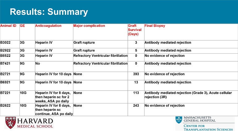 Results: Summary Final Biopsy Graft Survival (Days) Major complication Anticoagulation GE Animal ID Antibody mediated rejection 3 Graft rupture Heparin IV 3G B3022 Antibody mediated rejection 5 Graft rupture Heparin IV 3G B2922 No evidence of rejection 0 Refractory Ventricular fibrillation Heparin IV 3G B8522 Antibody mediated rejection 0 Refractory Ventricular fibrillation No 9G B7421 No evidence of rejection 393 None Heparin IV for 10 days 9G B2721 Antibody mediated rejection 13 None Heparin IV for 10 days 9G B6921 Antibody mediated rejection (Grade 3), Acute cellular rejection (3R) 113 None Heparin IV for 8 days, then heparin sc for 2 weeks, ASA po daily 10G B7221 No evidence of rejection 243 None Heparin IV for 8 days, then heparin sc continue, ASA po daily 10G B2622