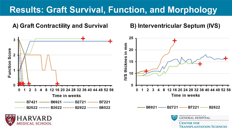Results: Xenograft survival • 3 - GE grafts functioned well initially. – POD 0: Refractory ventricular fibrillation. No AMR – POD 3: Graft necrosis, rupture: AMR – POD 5: Graft necrosis, rupture: AMR • 9 - GE – POD 0: Refractory Ventricular fibrillation – POD 13: AMR (strongly positive preop crossmatch) – POD 393: Preserved function, normal myocardium (protocol biopsies): slowly progressive graft hypertrophy • 10 - GE – POD 113: Combined CMR, AMR; progressive hypertrophy – POD 243: Preserved function, normal myocardium (protocol biopsies); slowly progressive hypertrophy