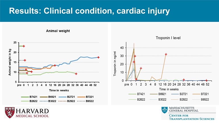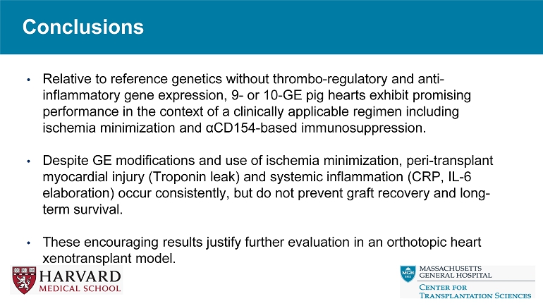 Conclusions • Relative to reference genetics without thrombo - regulatory and anti - inflammatory gene expression, 9 - or 10 - GE pig hearts exhibit promising performance in the context of a clinically applicable regimen including ischemia minimization and αCD154 - based immunosuppression. • Despite GE modifications and use of ischemia minimization, peri - transplant myocardial injury (Troponin leak) and systemic inflammation (CRP, IL - 6 elaboration) occur consistently, but do not prevent graft recovery and long - term survival. • These encouraging results justify further evaluation in an orthotopic heart xenotransplant model.