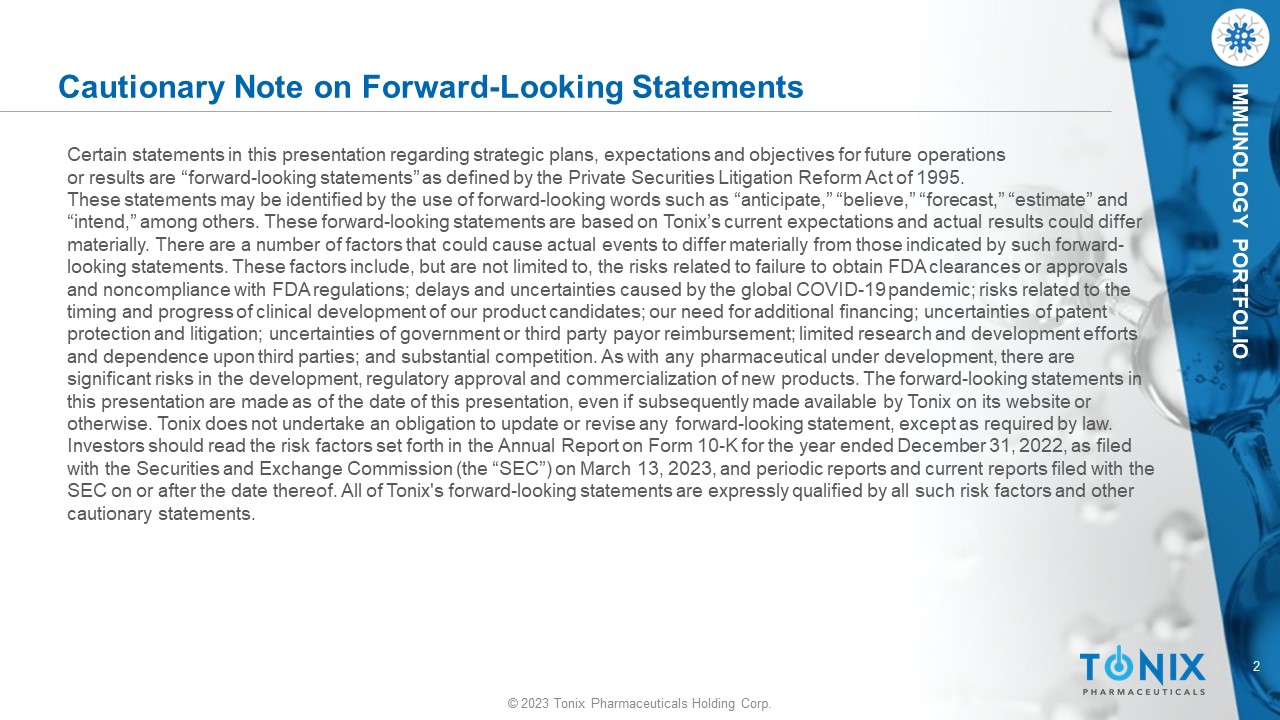 © 2023 Tonix Pharmaceuticals Holding Corp. 2 © 2023 Tonix Pharmaceuticals Holding Corp. IMMUNOLOGY PORTFOLIO Cautionary Note on Forward - Looking Statements Certain statements in this presentation regarding strategic plans, expectations and objectives for future operations or results are “forward - looking statements” as defined by the Private Securities Litigation Reform Act of 1995. These statements may be identified by the use of forward - looking words such as “anticipate,” “believe,” “forecast,” “estimate” a nd “intend,” among others. These forward - looking statements are based on Tonix’s current expectations and actual results could diff er materially. There are a number of factors that could cause actual events to differ materially from those indicated by such fo rwa rd - looking statements. These factors include, but are not limited to, the risks related to failure to obtain FDA clearances or a ppr ovals and noncompliance with FDA regulations; delays and uncertainties caused by the global COVID - 19 pandemic; risks related to the timing and progress of clinical development of our product candidates; our need for additional financing; uncertainties of pa ten t protection and litigation; uncertainties of government or third party payor reimbursement; limited research and development e ffo rts and dependence upon third parties; and substantial competition. As with any pharmaceutical under development, there are significant risks in the development, regulatory approval and commercialization of new products. The forward - looking statements in this presentation are made as of the date of this presentation, even if subsequently made available by Tonix on its website o r otherwise. Tonix does not undertake an obligation to update or revise any forward - looking statement, except as required by law. Investors should read the risk factors set forth in the Annual Report on Form 10 - K for the year ended December 31, 2022, as file d with the Securities and Exchange Commission (the “SEC”) on March 13, 2023, and periodic reports and current reports filed wit h t he SEC on or after the date thereof. All of Tonix's forward - looking statements are expressly qualified by all such risk factors and other cautionary statements.